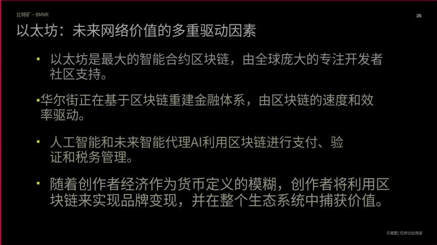 Maximizing Treasury Returns: Optimizing staking rewards (alpha strategies provided by advisors such as Tom DeMark), optimizing cash returns, and engaging in value-added capital market transactions (potentially including mergers and acquisitions in the future). BITM is debt-free, has approximately $600 million in cash, and has staked about two-thirds of its Ethereum, yielding annualized rewards of approximately $200 million, which will reach $300 million after full staking (approximately $1 million per day). If Ethereum reaches $12,000, staking rewards will increase to $2.4 billion. Meanwhile, the amount of Ethereum held per share has increased tenfold since June 30th.