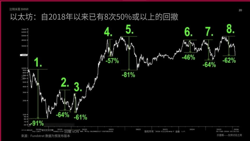Tom Lee turned to Ethereum. He acknowledged that many people are frustrated with Ethereum, but pointed out that since 2018, Ethereum has experienced eight drops of more than 50%, each time achieving a V-shaped rebound at almost the same speed, recovering 100%.