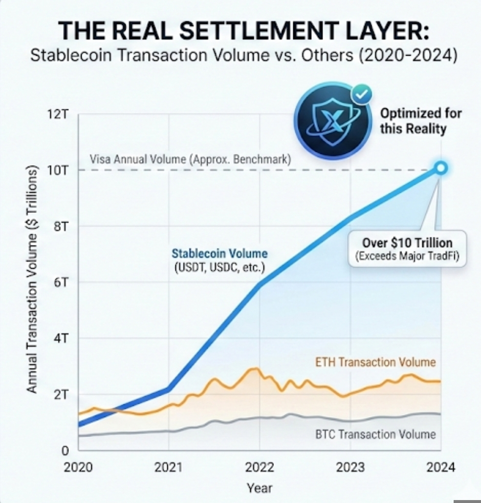 We still talk about Layer 1 competition as if ETH, SOL, or BTC are the center of gravity. But if you look at transaction volume instead of narratives, the texture changes. In 2024, stablecoin transfer volume crossed well over $10 trillion annually. That number matters because it exceeds Visa’s annual payment volume in some years. It tells you something uncomfortable. The dollar, wrapped on-chain, is already functioning as the real settlement layer for crypto activity.