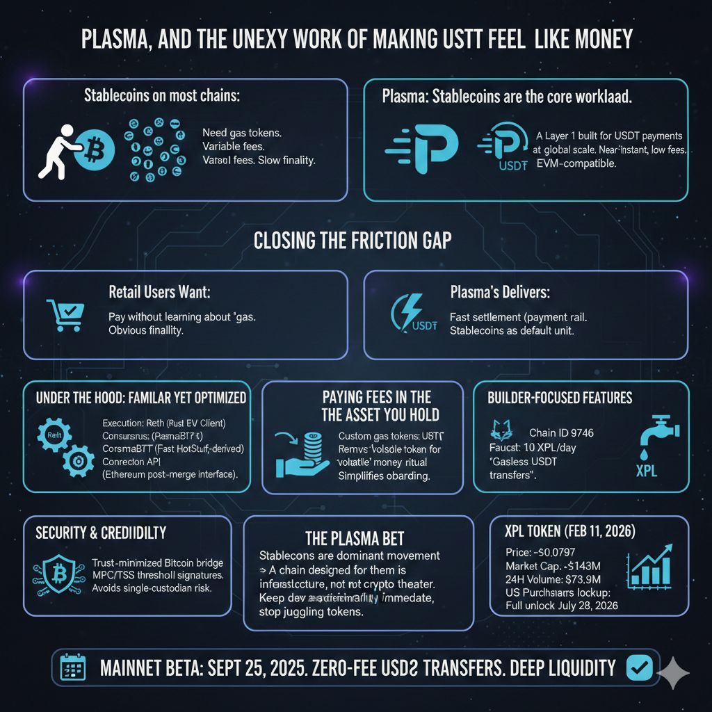 Plasma’s “gasless USDT transfers” pitch sits in that same category: reduce user friction where it most often kills adoption. The mainnet beta announcement explicitly positioned the launch (September 25, 2025) around zero-fee USD₮ transfers and deep liquidity from day one, aiming to make the chain useful immediately rather than “promising utility later.”Because, bluntly: if your payment rail needs a tutorial, it isn’t a payment rail.Security is where Plasma leans into a different kind of credibility. Instead of pretending payments are only a speed problem, it ties the story to neutrality and censorship resistance via a Bitcoin bridge model. The docs describe a trust-minimized bridge where verifiers confirm burns and then produce threshold signatures (MPC/TSS style) so no single verifier holds the full key needed to release BTC. That’s not the same as “trustless in the absolute sense,” but it is a clear attempt to avoid the classic “one custodian controls the wrapped asset” failure mode.It’s also not presented as “everything is live, right now.” Plasma’s own chain page says the mainnet beta launches with the core architecture (PlasmaBFT + modified Reth execution), while other features (like confidential transactions and the Bitcoin bridge) roll out incrementally as the network matures. That kind of pacing is healthy. People will still argue about it.If you care about the token because it’s part of the chain’s mechanics, XPL is already trading. On Binance’s price page, as of Feb 11, 2026 (UTC), XPL was around $0.0797, with a listed market cap around $143M and $73.9M 24-hour volume (numbers move, obviously).And token distribution has real-world constraints: Plasma’s docs note that US purchasers face a lockup schedule, with full unlock referenced for July 28, 2026, which is a reminder that “payments infrastructure” lives under regulatory gravity, not just code.The more subtle question is what happens when a chain is built around a single economic center of gravity: stablecoins. That can be a strength — predictable fees, clear UX, obvious product-market fit — and also a constraint, because it forces the ecosystem to take issuer realities seriously (listing decisions, compliance pressure, liquidity plumbing). Plasma’s bet is that the upside wins: if stablecoins are already the dominant on-chain money movement, then a chain designed around them will look less like crypto theater and more like infrastructure.That’s the real pitch hiding behind the acronyms: keep the developer experience familiar, make finality feel immediate, and stop asking normal people to juggle extra tokens just to move dollars.