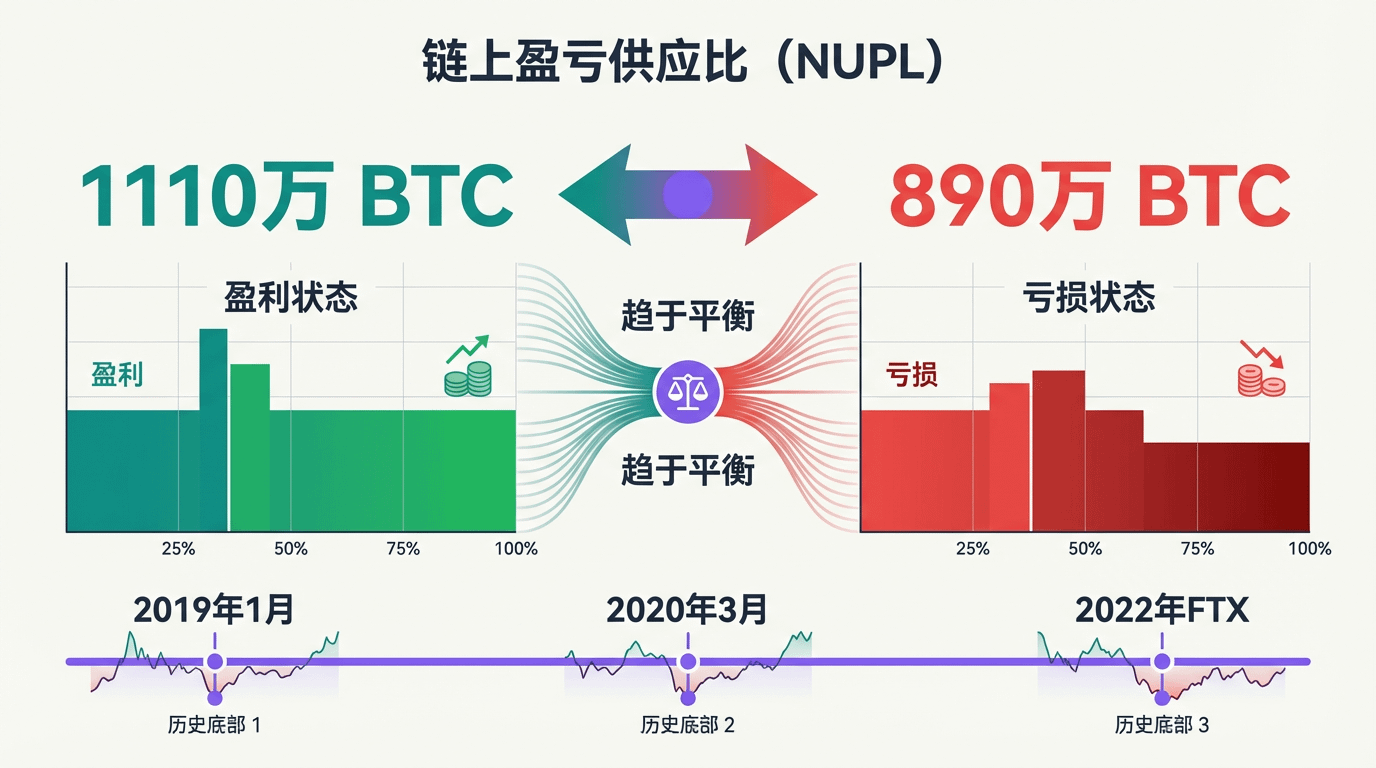 - 当前状态:盈利供应1110万BTC,亏损供应890万BTC,比例趋于平衡