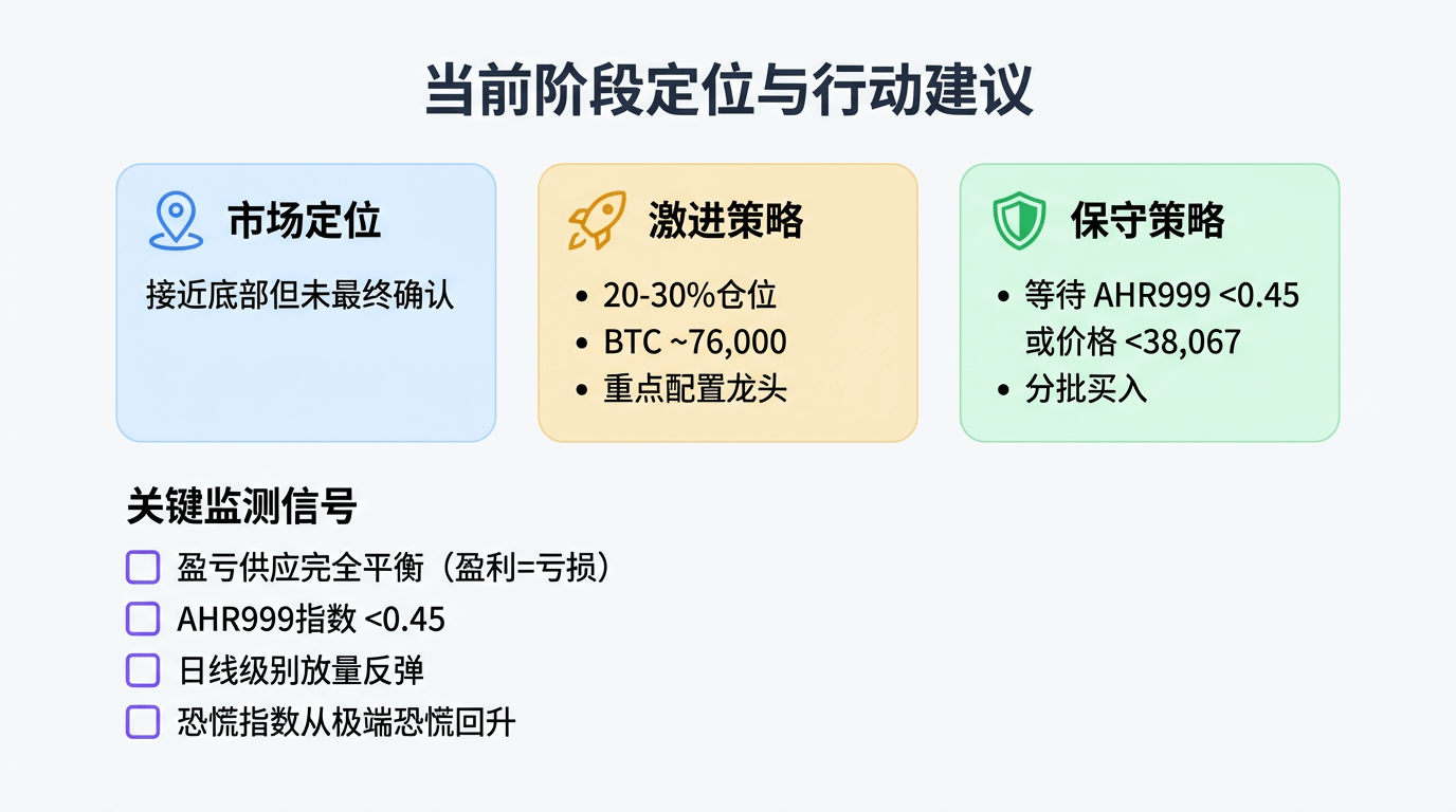 关键洞察:链上数据和情绪指标强烈暗示底部临近,但估值指标(AHR999、2年MA)显示市场可能尚未完全见底。这种分歧表明当前可能处于"接近底部但未确认"的阶段。