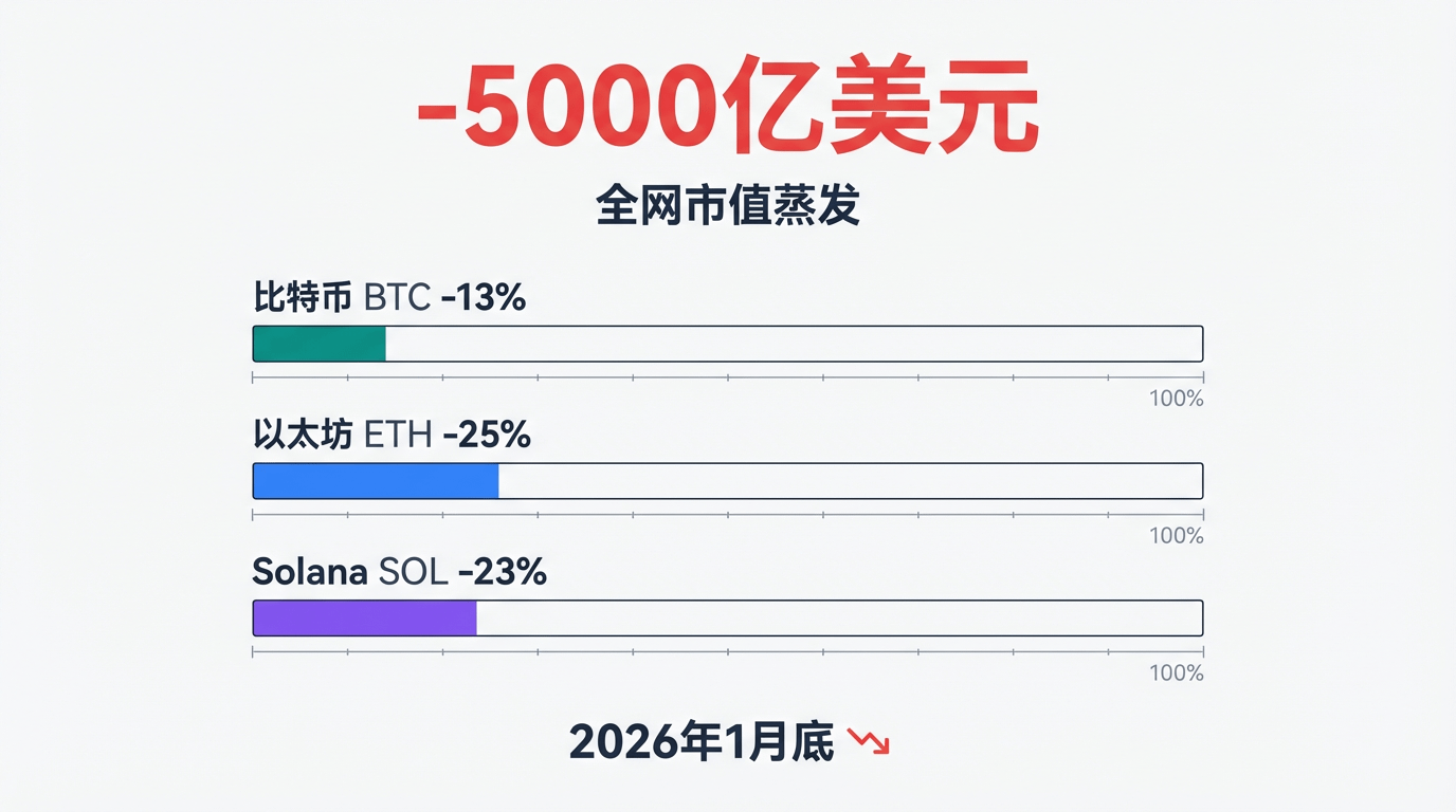 抄底是加密货币投资中最诱人却也最残酷的策略——它意味着在价格暴跌时买入资产,以捕捉市场复苏的巨大潜力。当前市场正经历显著下跌:比特币(BTC)在2026年1月底暴跌13%,以太坊(ETH)重挫25%,Solana(SOL)暴跌23%,全网市值蒸发超过5000亿美元。恐慌情绪弥漫,社交媒体讨论显示投资者信心降至低点。然而,历史表明,这种极端恐慌往往孕育着最佳投资机会。本文基于多维度数据(技术指标、链上信号、市场情绪),为您解析何时才是真正的抄底时机。