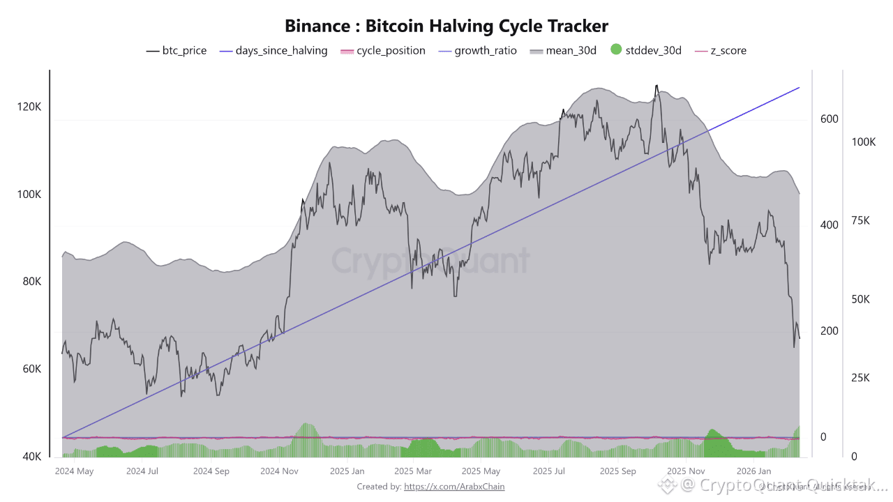 Data from the Bitcoin Halving Cycle Tracker on Binance shows that the market has currently reached approximately 662 days after the halving, a stage that historically falls around the midpoint of the cycle. This indicates that the market has moved beyond the initial post-halving surge and has begun entering a phase of balance and gradual structural building.