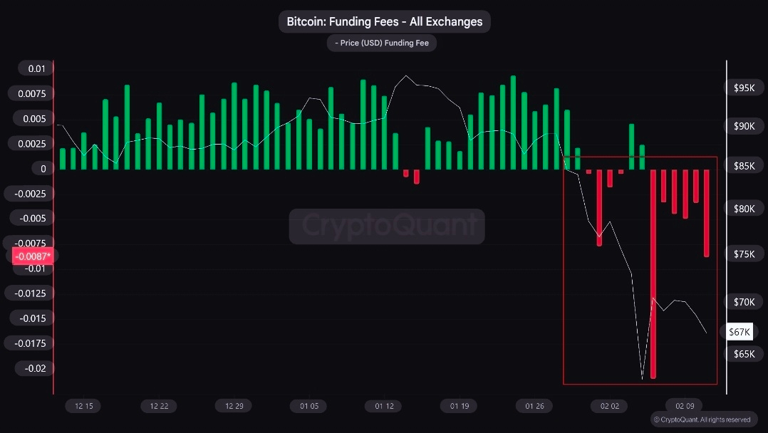 In such an environment, if a strong upward move occurs (from solid spot demand, positive news, or initial liquidations), the probability of cascading short liquidations increases, generating short-term short squeeze pressure that rapidly pushes the price higher. However, the severely negative funding comes in the context of a clear bear market (per CryptoQuant, on-chain indicators "extremely bearish," with negative ETF flows and weak demand), so the downtrend may continue if sufficient support does not arrive, and short positions remain profitable