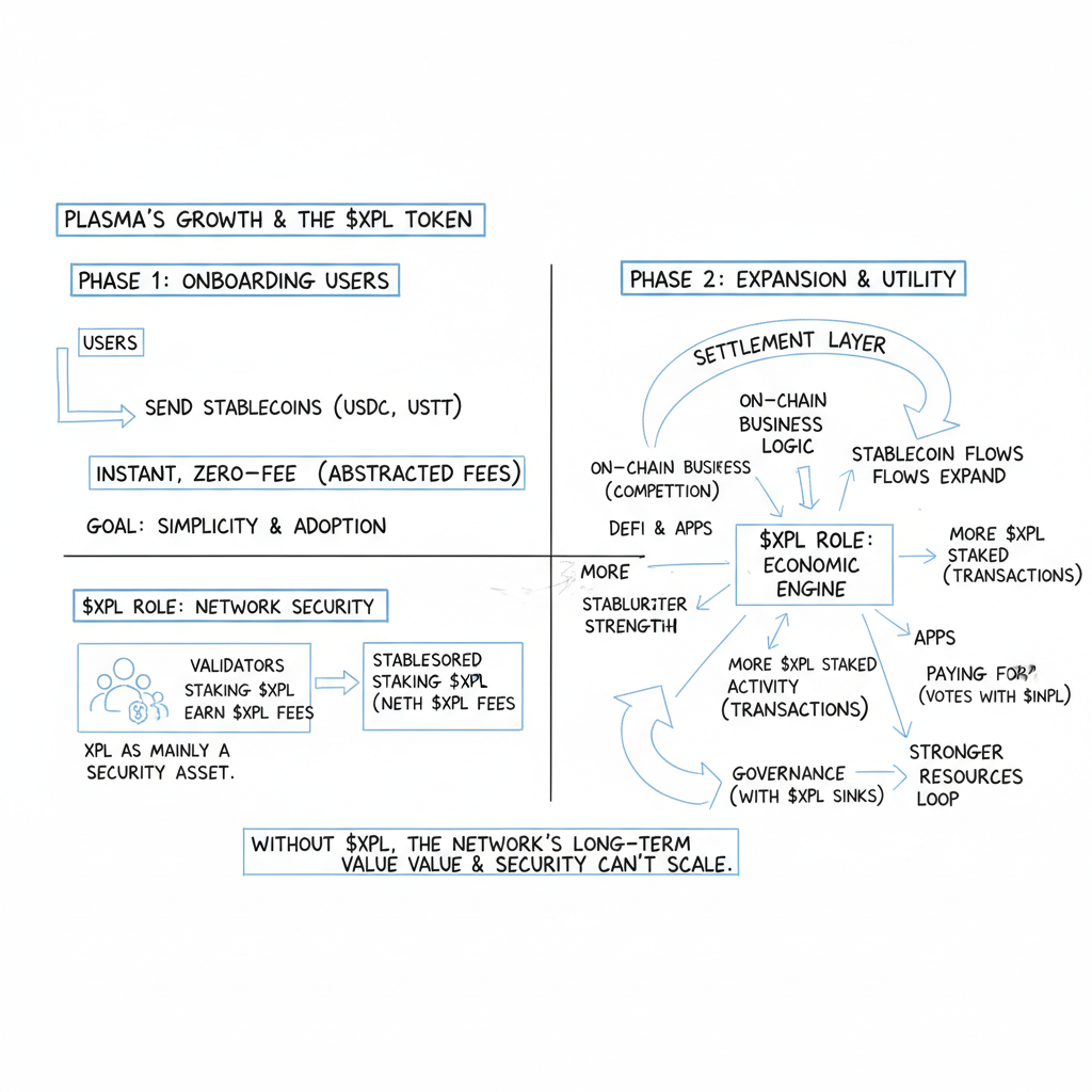 Ultimately, Plasma’s model prioritizes onboarding through stablecoins while relying on its native token to secure and coordinate the system underneath.xpl isn’t required for someone to send dollars—it exists because a Layer 1 needs a native security asset, validator incentives, and a mechanism to tie network activity to long-term economics.
