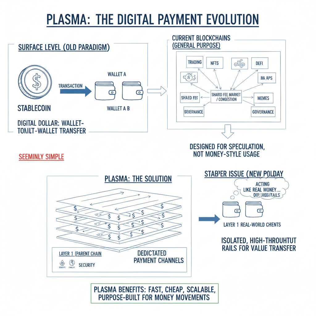 Plasma look like the simplest thing in crypto. A digital dollar moves from one wallet to another, and it feels like we already have the answer to payments. That surface level view is exactly why most investors miss the deeper issue. Stablecoins are acting more and more like real money, but they are still forced to run on rails that were not designed for money style usage. Most chains were built to serve everything at once trading, tokens, apps, memes, NFTs, governance, all competing for the same space and the same fee market. That design works when the main activity is speculation. It becomes inefficient when the main activity becomes stable value moving constantly, at high volume, with real world expectations.