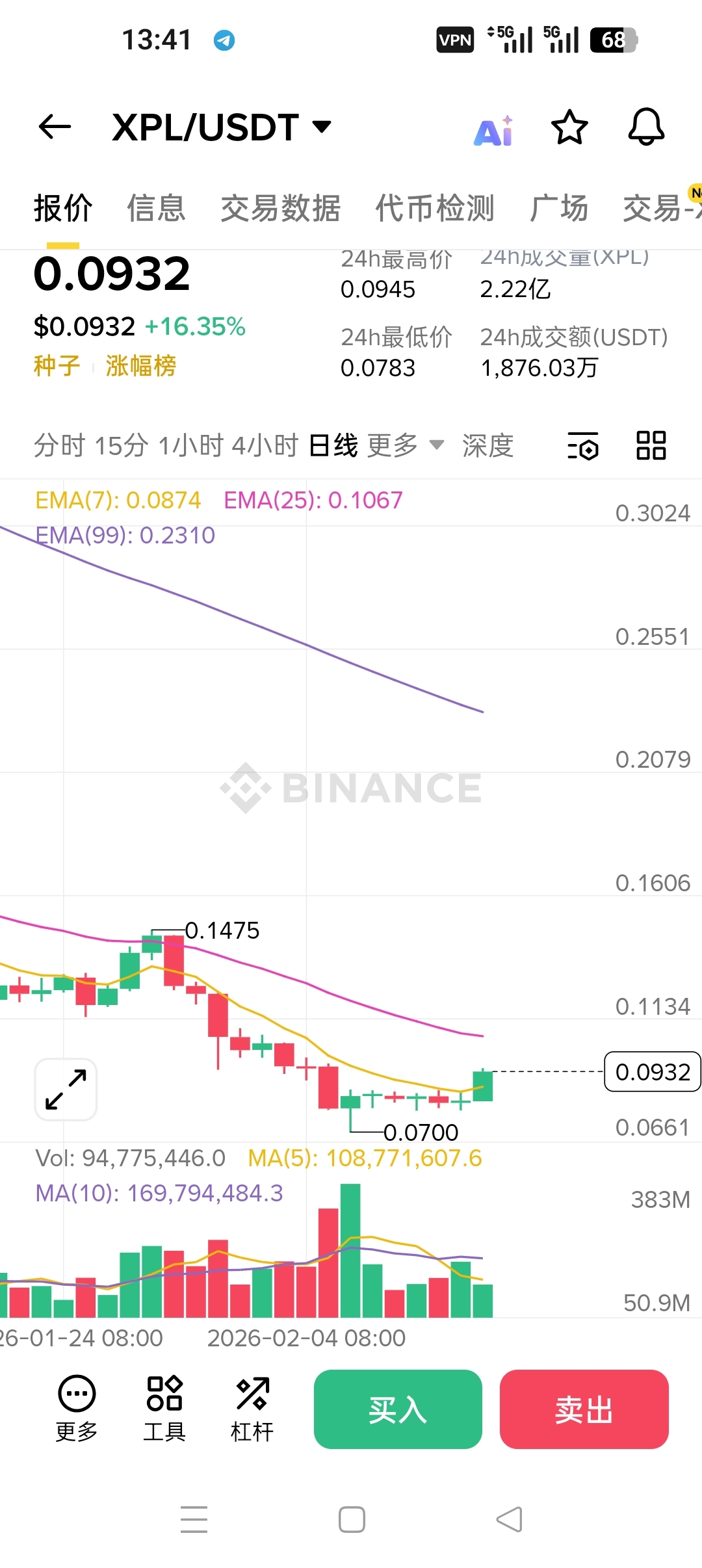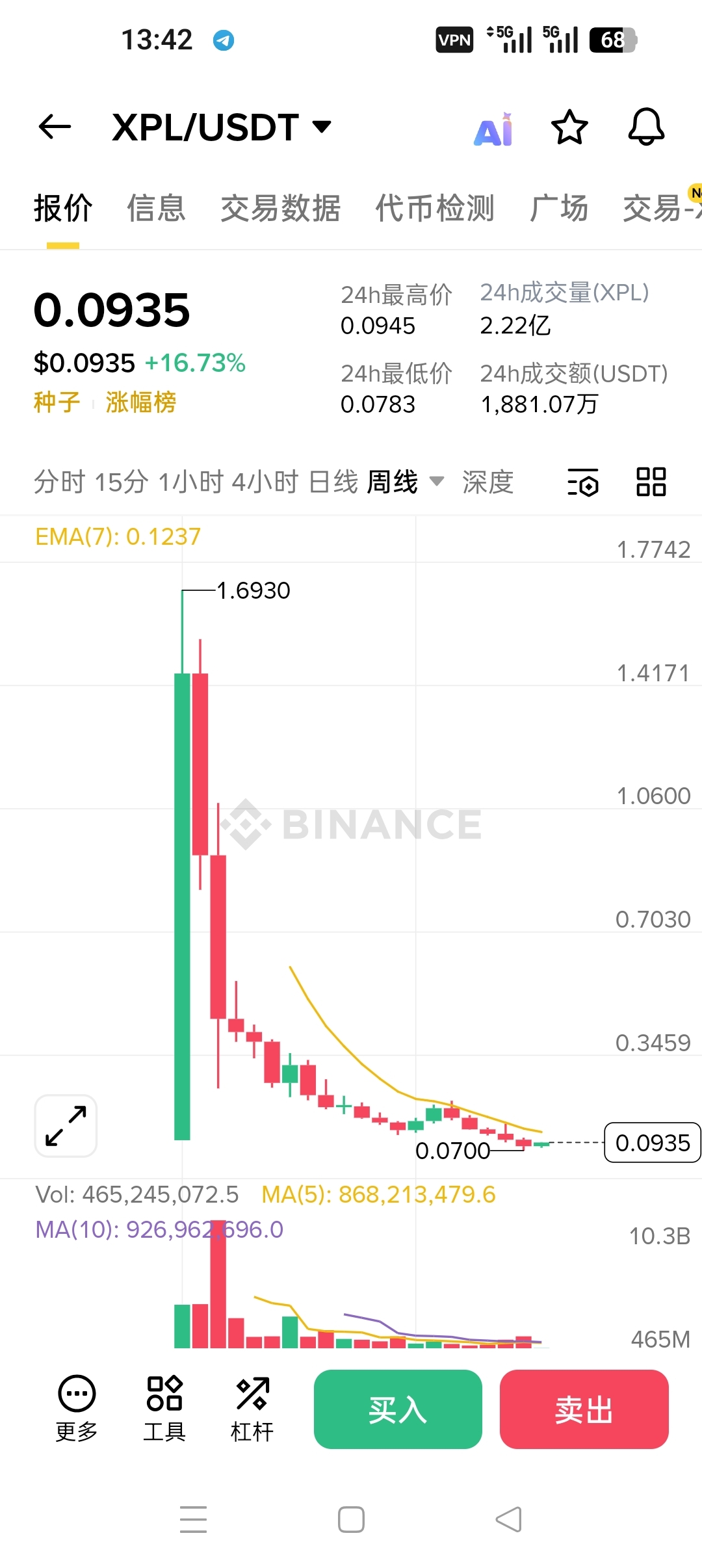First, look at the daily chart, $XPL dropped from 0.1475 all the way to 0.0700, with almost no decent rebound in between. I have 3 friends who bought at around 0.12, and now they are all complaining in the group. But starting yesterday, a bullish candle directly pulled up by 16%+, and the trading volume increased from 50.9M to 94.7M, which is not something retail investors can drive. Now looking at the weekly chart, it has been declining from the historical high of 1.6930, and now it has been consolidating around 0.07 for almost 2 weeks. The EMA(7) has finally started to turn upwards; this is the most standard 'W bottom' pattern I have seen this year.