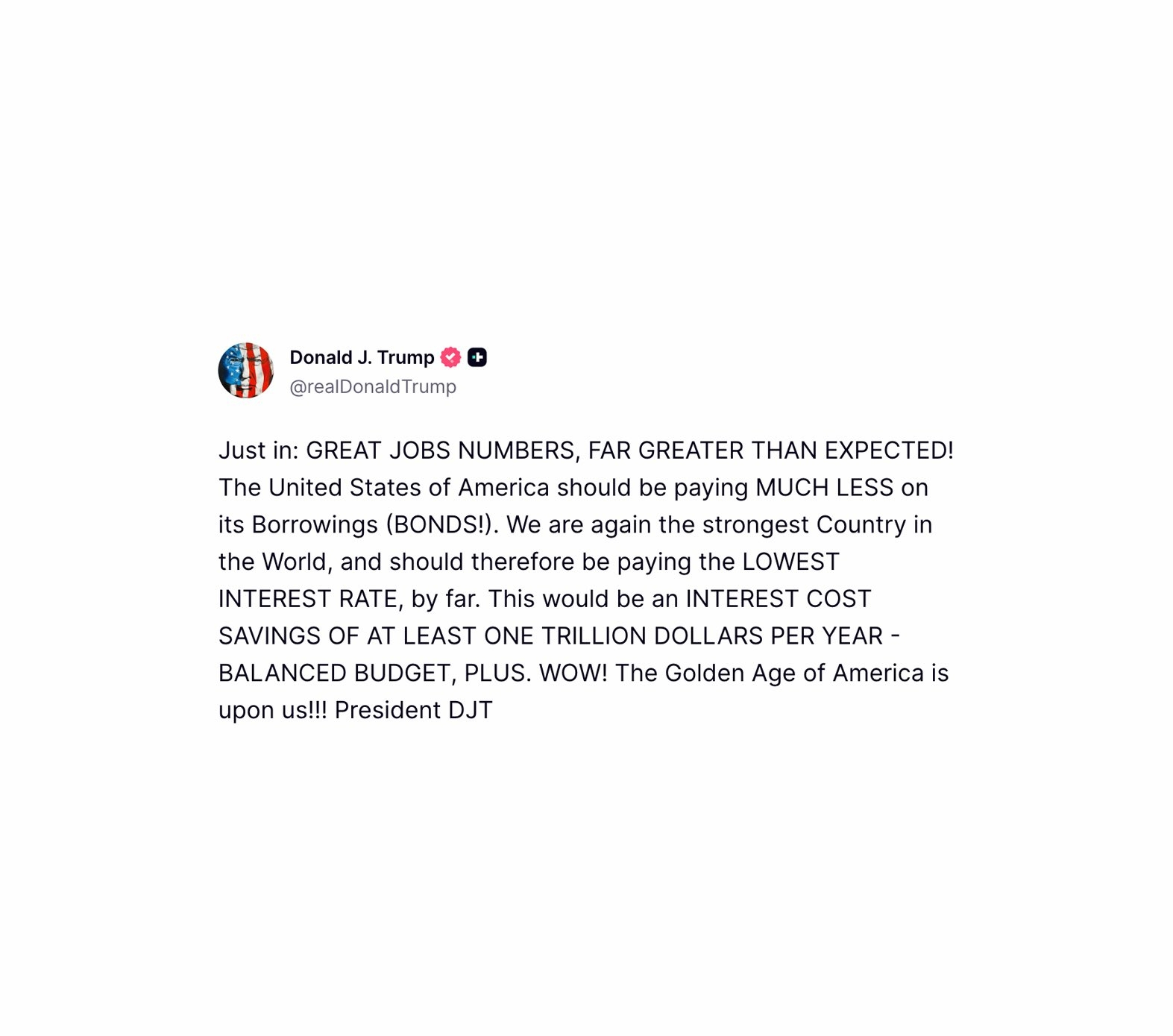 Former President Trump just reacted to the latest US jobs data, calling it “far greater than expected” and saying the US should be paying the LOWEST interest rate.