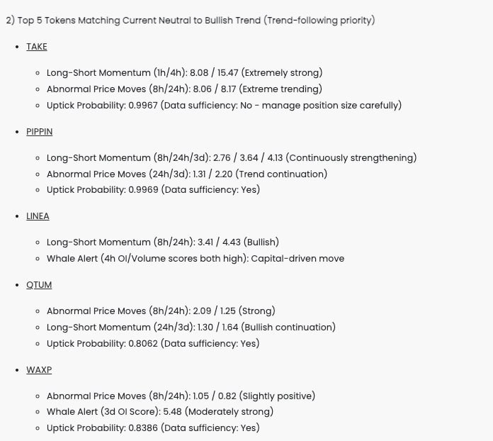 Blave AI identifies PIPPIN, WAXP, and ON as relatively strong tokens today.