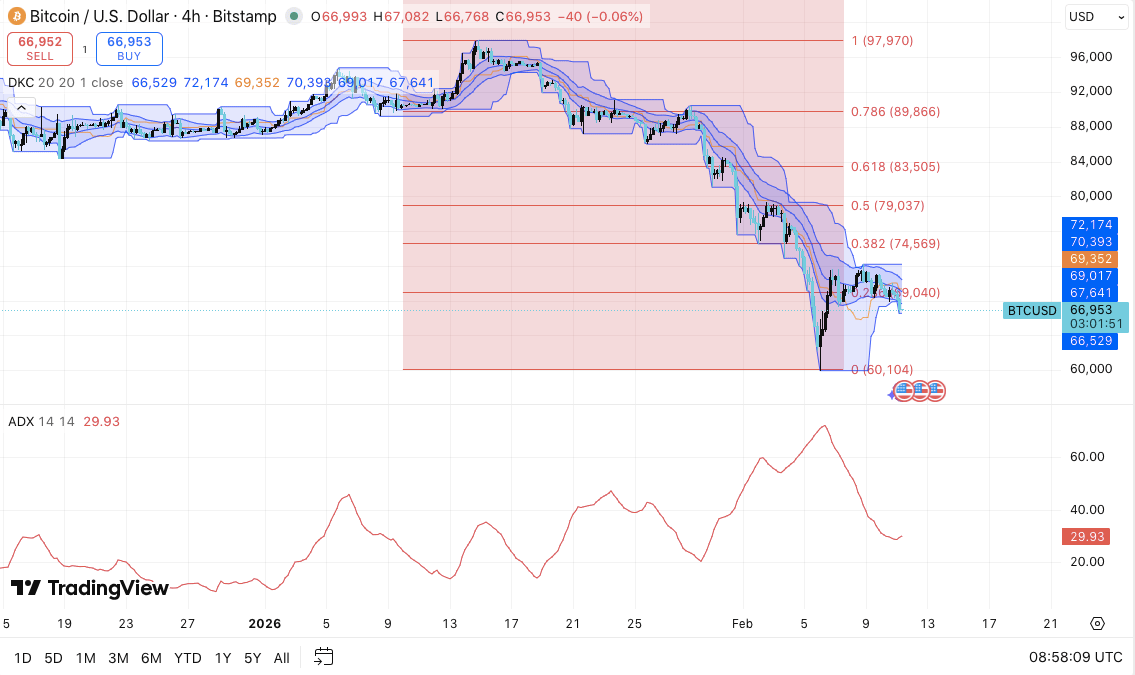 Price now trades below the 0.236 Fibonacci retracement at $69,040 — immediate resistance. This level acts as the first breakout trigger. A decisive reclaim of $69,000 would open a path toward $74,569 (0.382 retracement) and potentially $79,037 (0.5 retracement), which would signal broader structural repair.