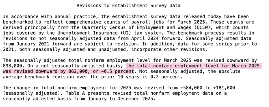 The Bureau of Labor Statistics issued a substantial annual benchmark revision, cutting the March 2025 job count by 898,000 on a seasonally adjusted basis and lowering the entire 2025 trendline. In effect, the labor market of last year was not as strong as previously believed.