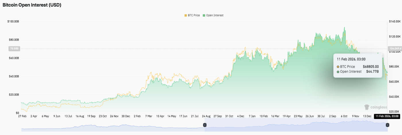 This week’s open interest data supports that mechanism. Bitcoin derivatives open interest has contracted to roughly $44.7 billion, down sharply from peaks above $80 billion. That decline signals deleveraging.