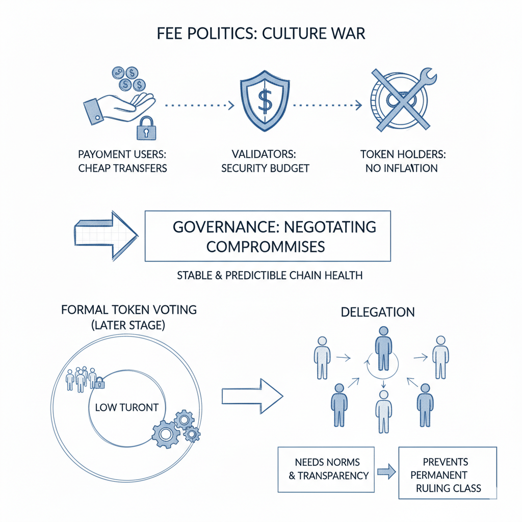 Fee politics can become culture war. Payments users want “don’t touch my cheap transfers,” validators want “don’t starve the security budget,” and token holders want “don’t inflate forever.” Those are normal competing interests. Governance is how those interests negotiate compromises, and the chain’s long-term health depends on whether it can keep those compromises stable and predictable.