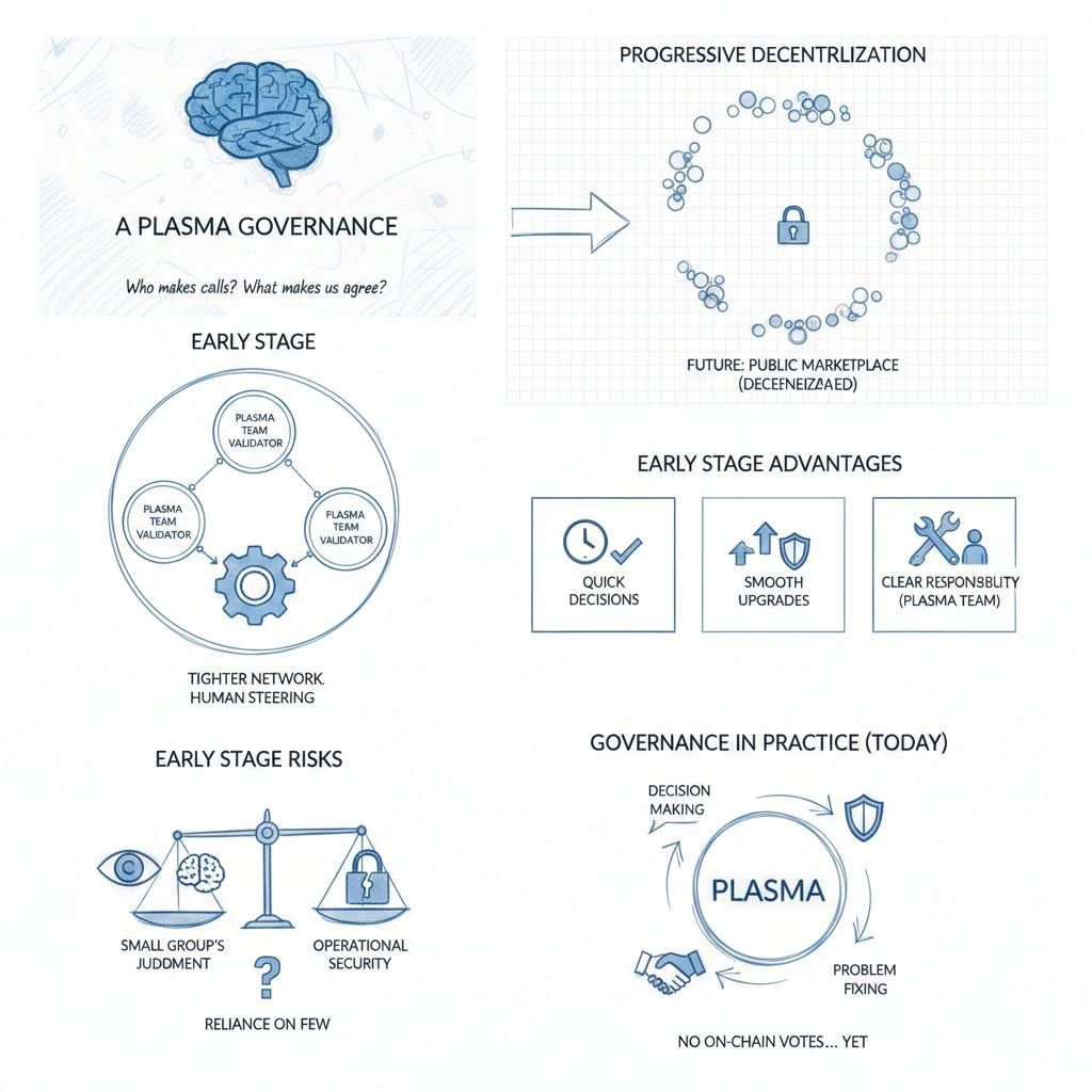 Right now, the biggest thing shaping Plasma’s governance is that it’s still in a progressive decentralization phase. In plain terms, the validator set isn’t a big public marketplace yet. The network is being run in a tighter way, with validators operated by the Plasma team during the early stage. That creates a very specific kind of “human steering.” Decisions can be made quickly, upgrades can be coordinated without drama, and if something breaks there’s a clear party responsible for fixing it. The downside is also clear: the system is relying on a smaller group’s judgment and operational security. That’s governance, even if nobody is clicking “vote” on-chain yet.