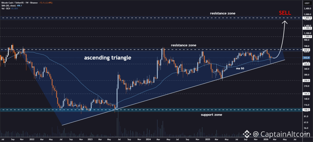 Immediate focus centers on whether Bitcoin Cash can secure acceptance above $660. Rejection at this ceiling has shaped consolidation throughout the past cycle. A confirmed breakout would expose BCH to the $1,000 region, where prior distribution once controlled market direction. Strength beyond that zone could reopen the path toward $1,300 and eventually $1,800 under sustained bullish pressure.