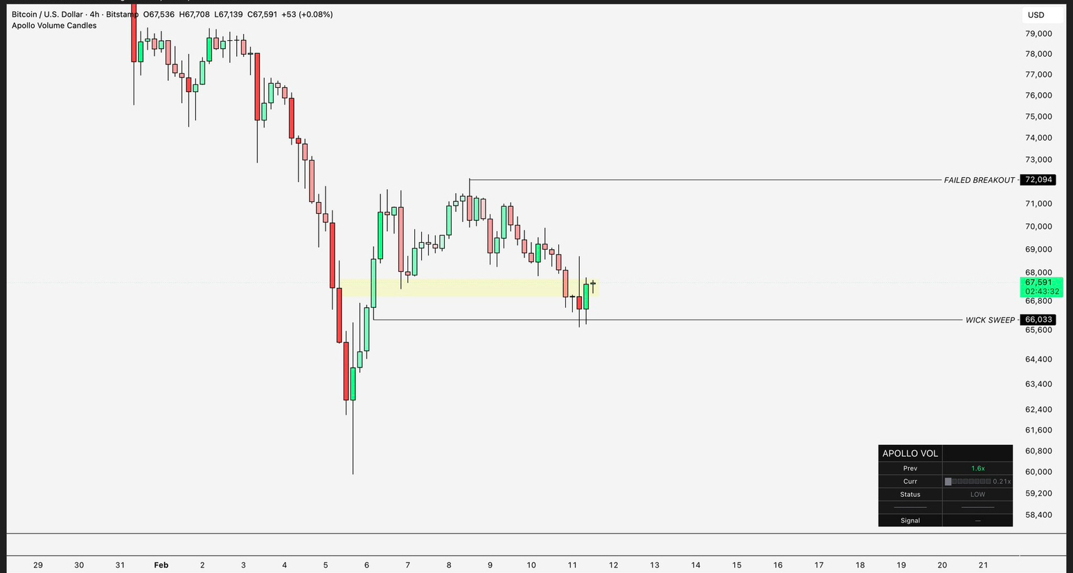 The most important behavior on the chart is the wick sweep below ~66k followed by immediate acceptance back above it. That tells you something specific: downside liquidity was taken, but sellers couldn’t press continuation. The response candle isn’t explosive, but it’s responsive — buyers showed up exactly where stops were vulnerable.