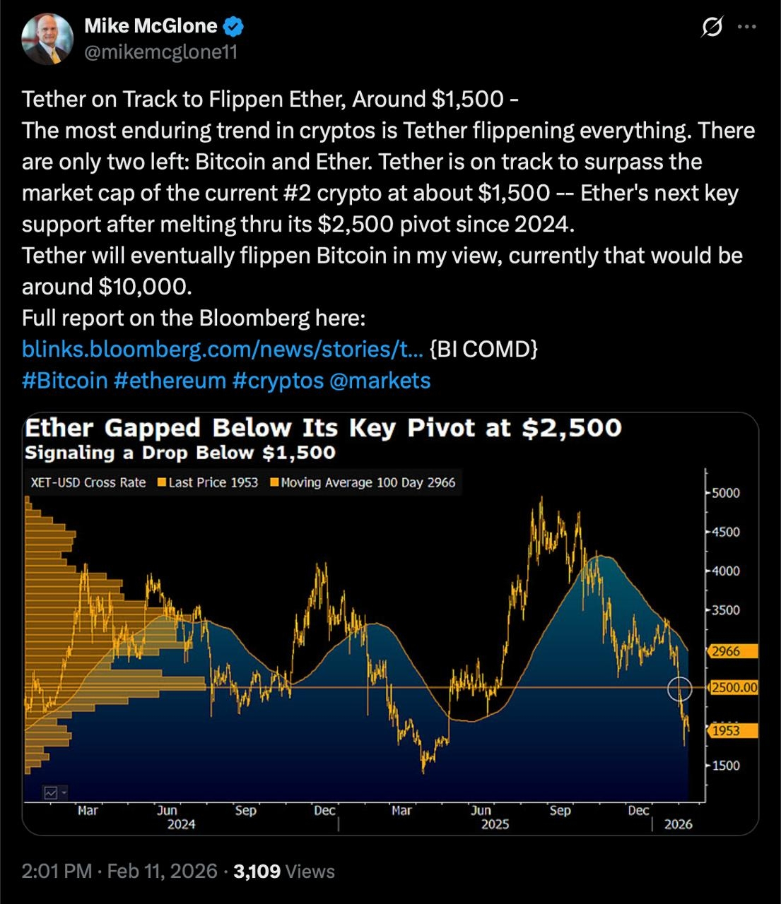 Bloomberg Intelligence analyst Mike McGlone recently argued that Tether is on track to surpass Ethereum in market capitalization, pointing to the structural strength of stablecoin demand even as Ether struggles below key technical levels.