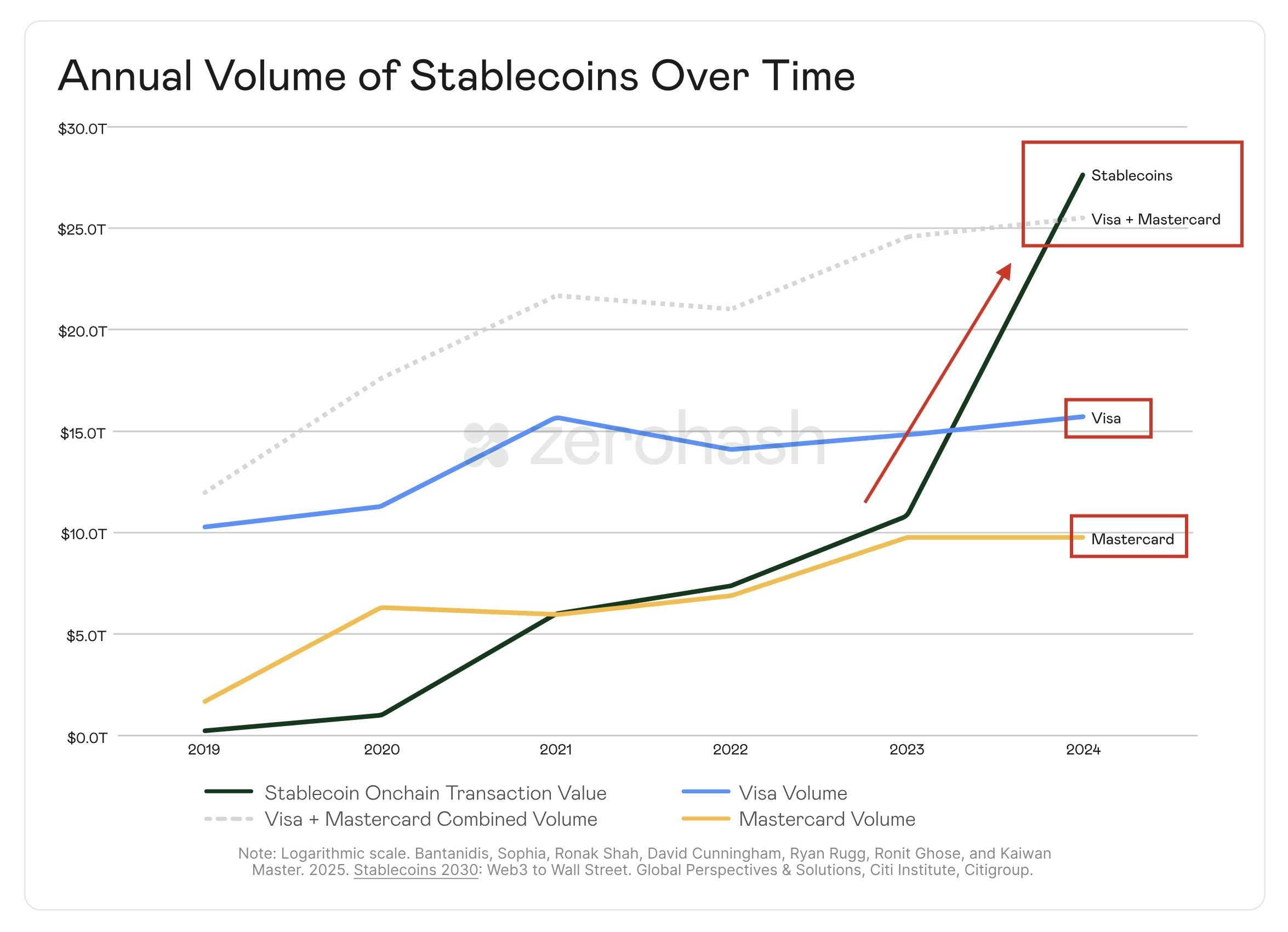 New data shows that annual onchain stablecoin transaction volume reached approximately $33 trillion in 2025, placing the sector at or even above the scale of global payment giants like Visa and Mastercard.