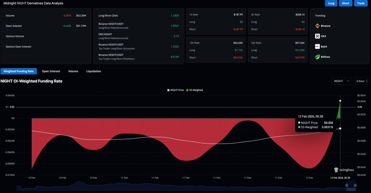 Midnight is trading above the psychological level of $0.0500 at the time of writing this report on Thursday, reflecting a slight recovery on the 4-hour chart. The price action of the NIGHT token shows a higher low on the same chart after a series of lower lows, indicating a potential trend reversal.