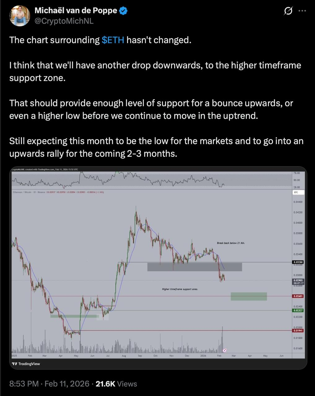From a technical perspective, analyst Michaël van de Poppe believes Ethereum’s broader structure remains intact. He suggests another move lower toward higher timeframe support could occur before a stronger rebound.