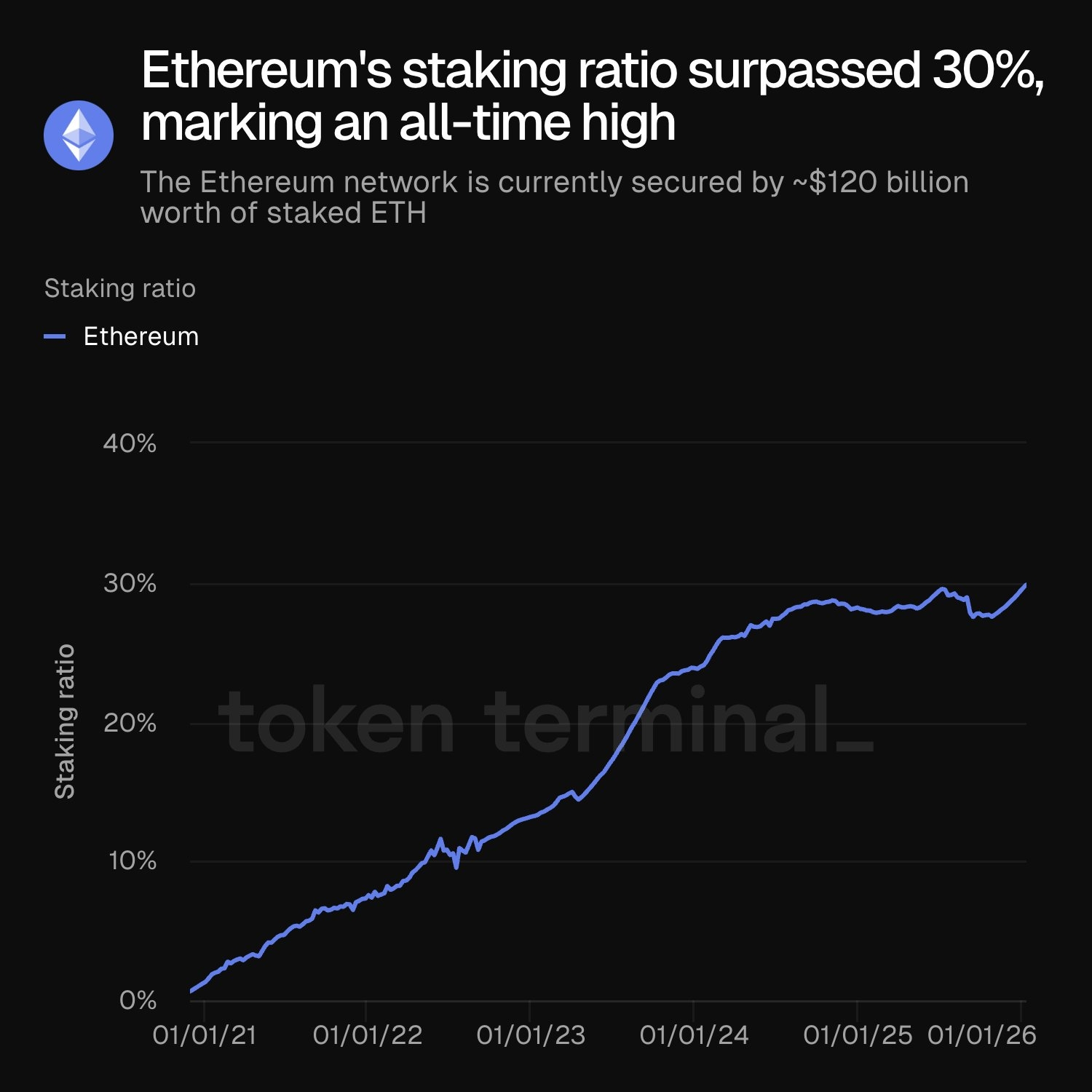 30% of Ethereum’s supply is locked in staking, tightening liquid supply.
