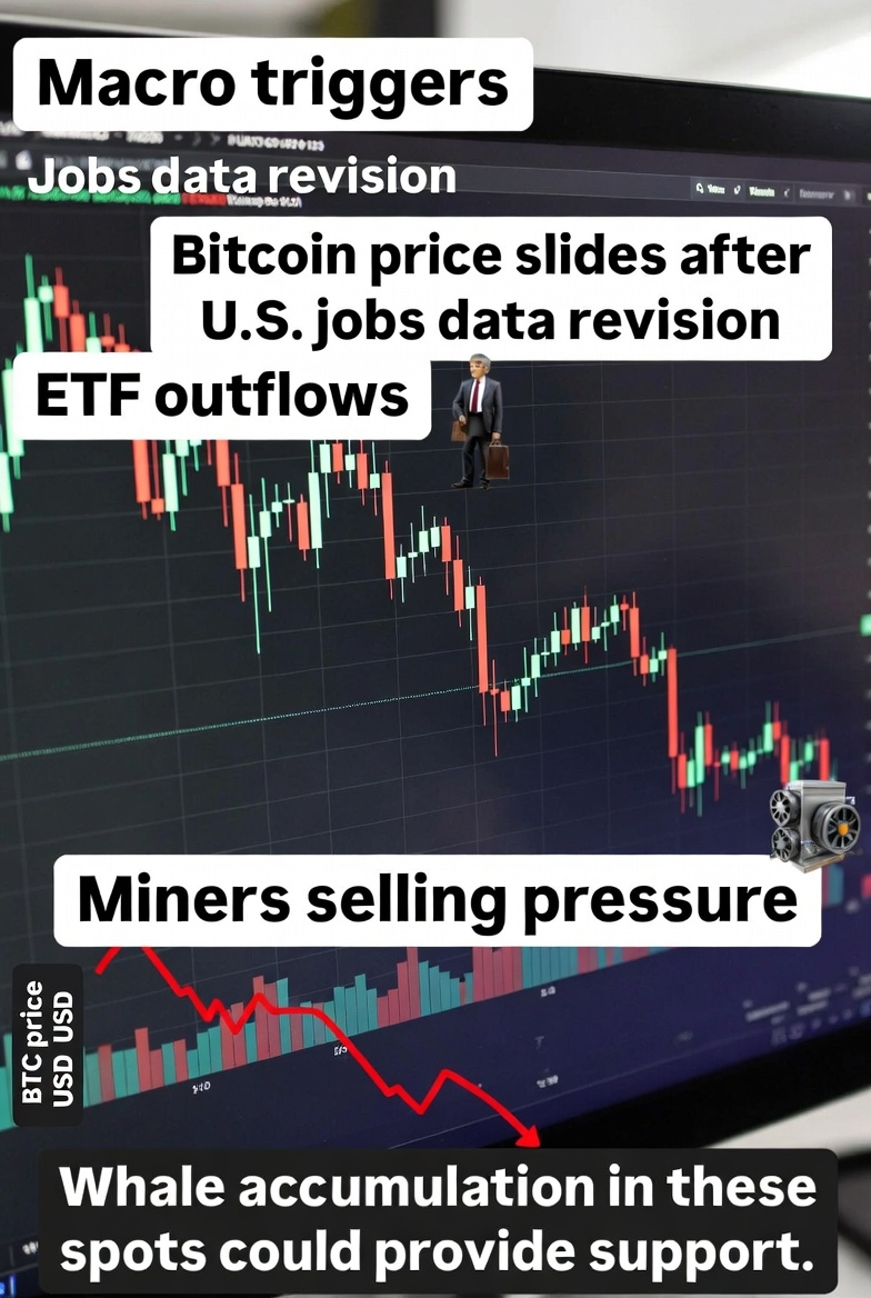 These typically include recent BTC price charts showing the downtrend, candlestick patterns indicating the slide, and possibly news-related visuals explaining macro triggers like jobs data revisions. Note that crypto markets remain highly volatile—always do your own research!