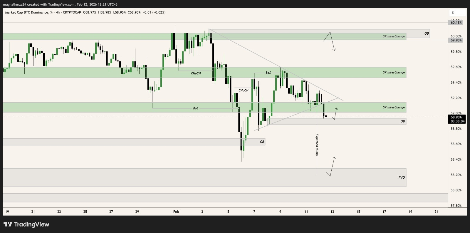 #BTC.D has broken down the triangle and now, if this dip continues we can expect %58.80. If this breaks down then %58.20 will be the next level, which is good for alts.