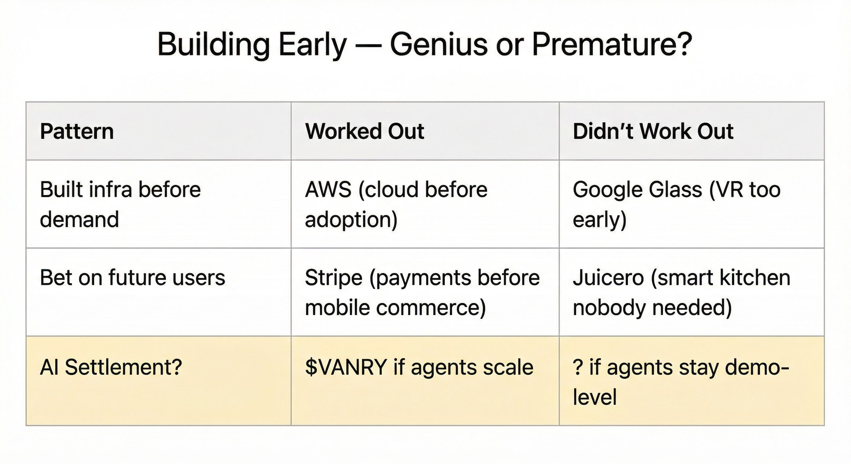 are we building payments infrastructure for AI agents that don't really exist yet? we've seen this before — infrastructure that arrives too early. somtimes it works out (AWS built cloud before most companies knew they neded it). usually it doesn't (remember when VR was supposed to replace offices by 2020?).#AI