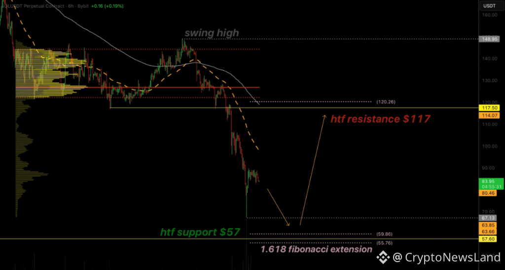 The $57 Fibonacci extension could become a critical zone for Solana's price reversal or capitulation.