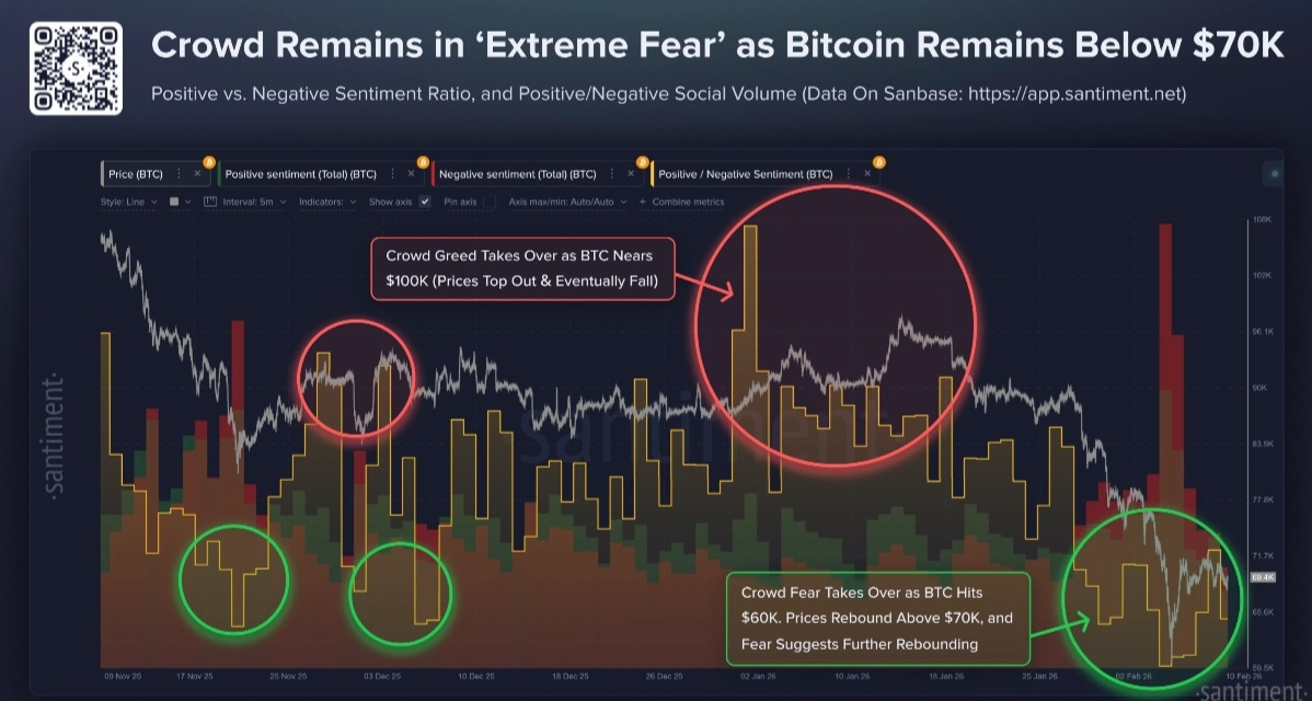 [Chart: Crowd Remains in 'Extreme Fear' as Bitcoin Remains Below $70K - Positive vs. Negative Sentiment Ratio, and Positive/Negative Social Volume]