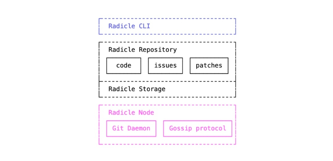 Radicle node: All nodes are identified by unique Decentralized Identifiers (DIDs) on the network; they can directly refer to each other via a public key and an address. Through Radicle’s gossip protocol, nodes exchange messages to discover and replicate repositories. When a secure connection is established between nodes, a fetch operation is initiated via Git to pull relevant objects into the node’s storage.