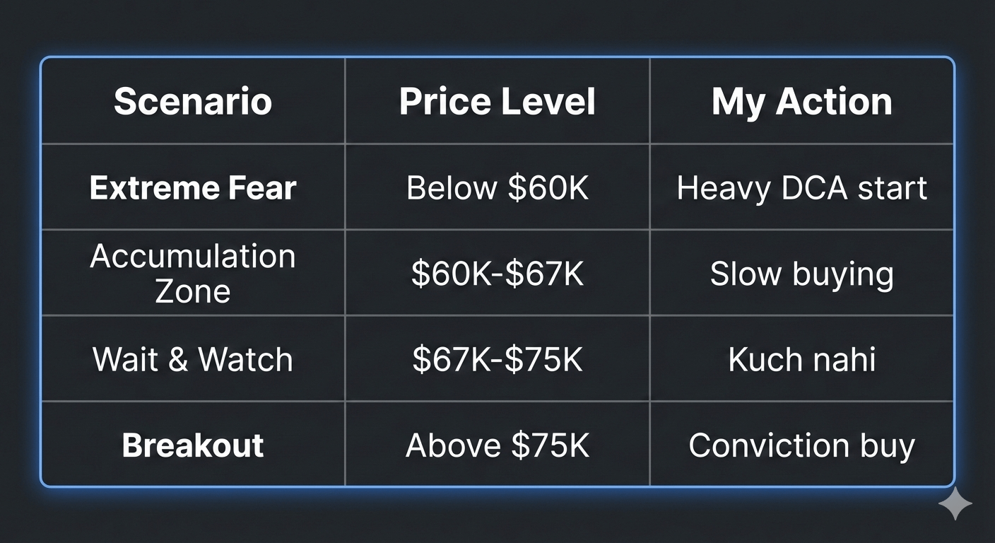 What I'm doing: Small DCA buys in the $65K-$67K zone. If we hit $60K, I get aggressive. If we break $75K, my conviction increases.
