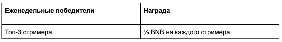 Go live with your camera and participate in our 4-week incubation program with a total prize pool of 4 BNB. Each week, a prize pool of 1 BNB will be distributed among the top 3 streamers.