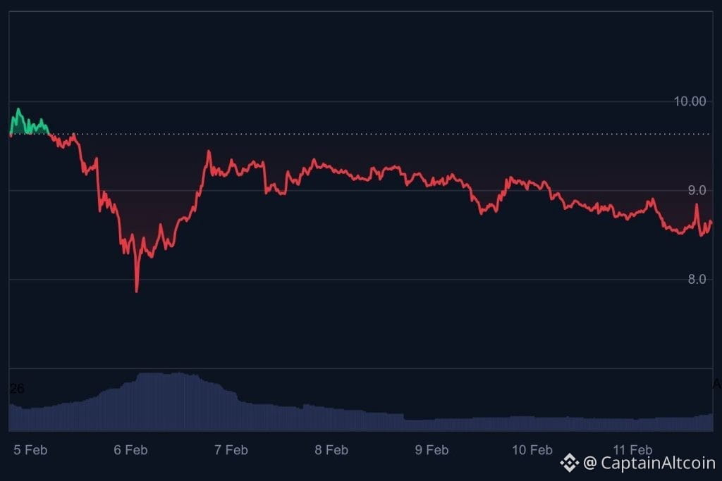 Avalanche has been under notable pressure this past week, with price action clearly reflecting a weakening short term trend. After starting the week on February 5, trading at $9.63, AVAX has drifted lower and was changing hands at $8.62 on February 11, an 11% decline over the period.