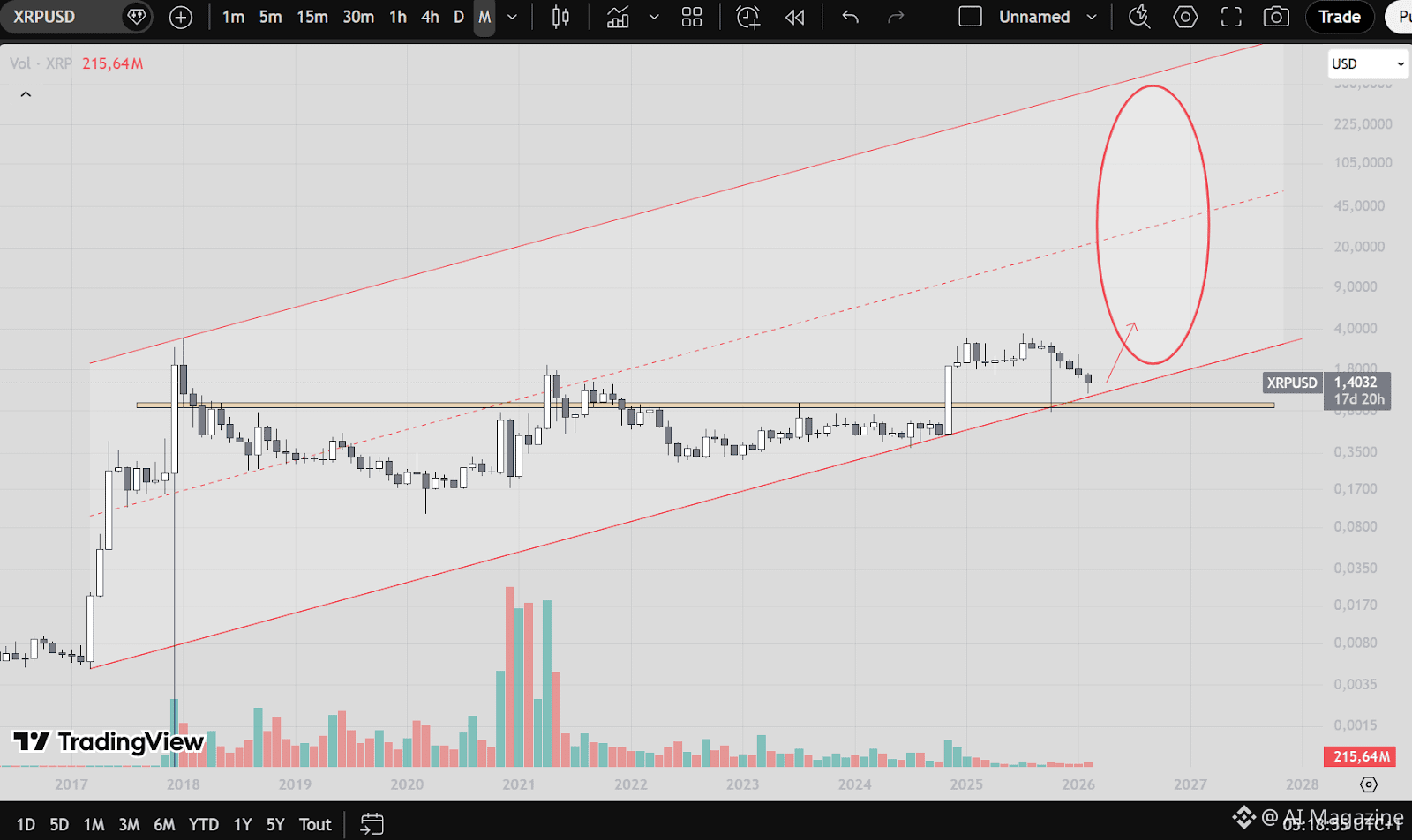 A dotted red mid-channel line runs through the structure, indicating a possible median trajectory. XRP currently trades close to the lower boundary of the channel. The price label on the chart shows #XRPUSD at $1.4032.