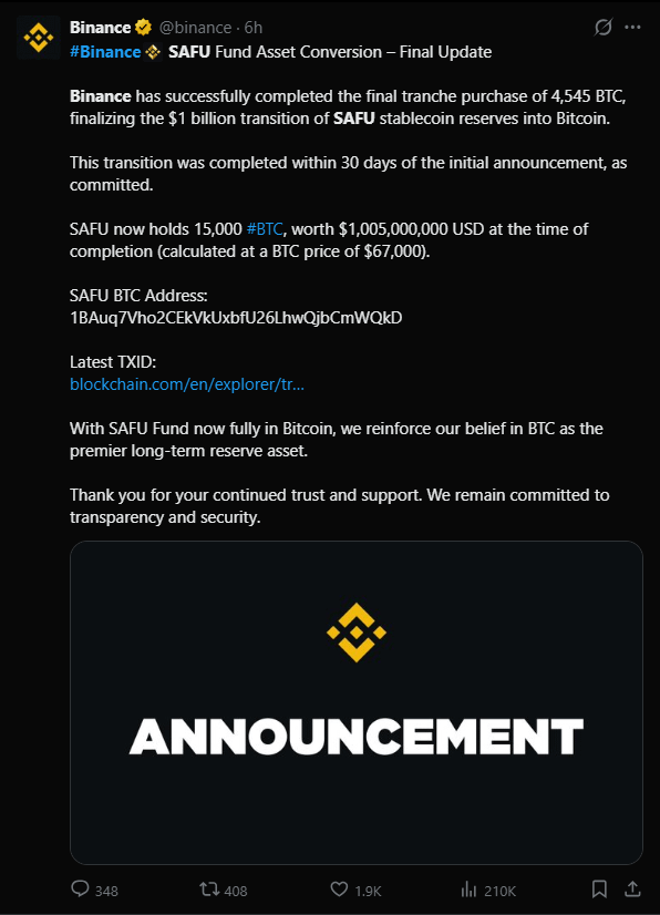 Today, 12/02/2026, Binance officially completed one of the largest and most purposeful Bitcoin purchase transactions in the history of the industry. The SAFU (Secure Asset Fund for Users) has transferred the entire $1 billion reserve from stablecoin to 15,000 $BTC , with an average price of only $66,666.67 – a figure that feels almost like a “jackpot” in the context of a market consumed by fear.