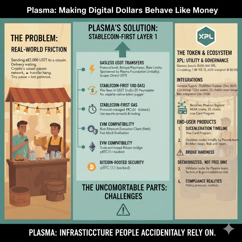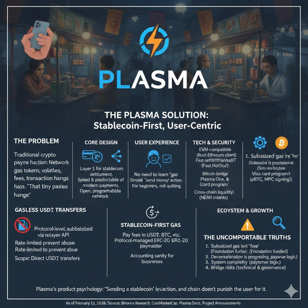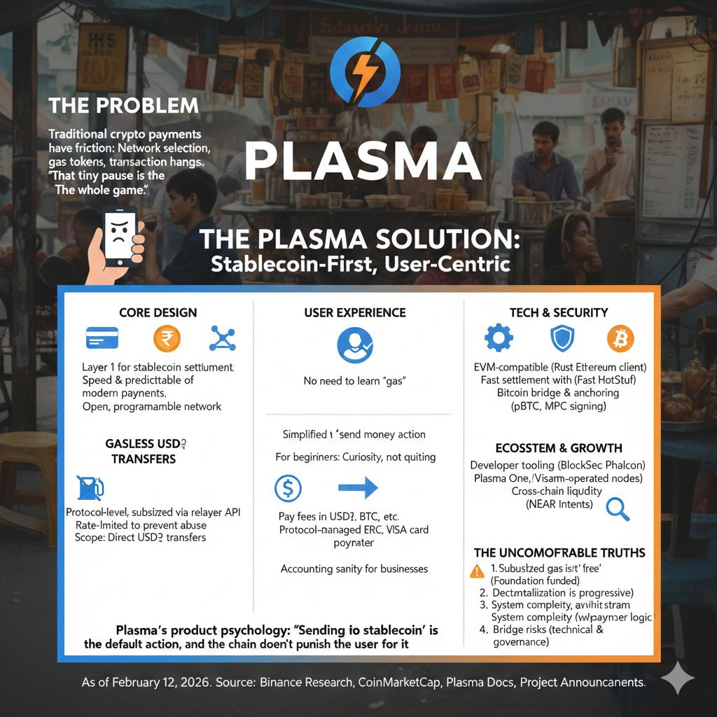 At a busy chai stall, the “payment problem” is never philosophical. Someone wants to send ₨2,000 worth of USDT to a cousin, right now, because the delivery guy is waiting and nobody wants to argue about exchange rates. The usual crypto friction shows up fast: pick the right network, keep a little gas token, hope fees don’t spike, hope the transfer doesn’t hang. In real life, that tiny pause is the whole game.Plasma is built around that pause. It’s a Layer 1 designed for stablecoin settlement first, not as a general-purpose chain that later also carries stablecoins. The practical promise is simple: stablecoins should move with the speed and predictability people expect from modern payments, while still living on an open, programmable network.The most noticeable design choice is also the most controversial: Plasma makes basic USD₮ transfers gasless, on purpose, at the protocol level. The way it does this isn’t magicit’s a relayer/paymaster setup managed through Plasma’s own relayer API, with controls and rate limits to prevent abuse. The sponsorship is tightly scoped to direct USD₮ transfers (not every possible contract call), and the docs are explicit that implementation details can evolve as they harden performance and security.That scope matters because it hints at Plasma’s worldview: a “send money” action should not feel like interacting with a blockchain at all. No extra token to buy. No “you’re short 0.0004 of something you’ve never heard of.” For beginners, that one missing step is the difference between curiosity and quitting.Here’s the blunt line: if a payment rail needs users to first learn what gas is, it’s not a payment rail.Plasma doesn’t pretend everything can be free forever, though. Their own FAQ makes the boundary clear: only simple USD₮ transfers are gasless; other transactions still pay fees, and those fees go to validators, maintaining incentives to secure the network.Then comes the second “real world” trick: stablecoin-first gas for everything else. Plasma allows fees to be paid in whitelisted assets like USD₮ (and BTC in some flows) so users and apps can stay inside the currency they already hold, instead of juggling a separate native token for every chain they touch. This is implemented through a protocol-managed ERC-20 paymaster—meaning developers don’t need to run their own gas abstraction layer just to give users a clean checkout experience.That’s not just nicer UX. It’s accounting sanity.If a fintech earns revenue in stablecoins and pays operational costs in stablecoins, “fees in stablecoins” stops being a feature and starts being basic compatibility with how businesses keep books. A builder trying to ship a remittance app does not want to explain why the app needs a volatile token balance sitting somewhere just to keep transfers alive.Under the hood, Plasma is still EVM-compatible. It uses a modern Rust Ethereum execution client (Reth) so Ethereum contracts and tooling can carry over without rewriting everything. That choice is less glamorous than new virtual machines, but it’s strategic: most stablecoin infrastructure already speaks EVM.The settlement speed side comes from PlasmaBFT, described in the official docs as a pipelined implementation of Fast HotStuffpart of the HotStuff family of BFT consensus protocols optimized for low-latency commits. In normal language: it’s designed to finalize blocks quickly and keep communication overhead under control when you want payment-like responsiveness.And then there’s the “anchoring” angle: Plasma’s architecture pairs that fast consensus and EVM execution with a Bitcoin bridge / Bitcoin-rooted security story. In their system overview, Plasma describes a modular stack that includes a trust-minimized Bitcoin bridge alongside the chain itself.The Bitcoin bridge is worth describing carefully because it’s where ideals meet engineering tradeoffs. Plasma’s docs present a design that introduces pBTC, meant to be backed 1:1 by real Bitcoin, using a verifier network and MPC-based signing for withdrawals, plus interoperability tooling (they mention a LayerZero OFT-based standard). That’s a lot of machineryand it’s exactly why bridges are always a risk surface in crypto, no matter how “trust-minimized” the intention is.So where does the token fit into all this?Plasma’s native token is XPL. On Binance Research’s project write-up, XPL is framed as the utility and governance token, used for gas at launch, staking post-decentralization, and as the base asset that still sits at the core even when users pay fees via custom gas tokens (through automated swap mechanics). They also list a genesis total supply of 10,000,000,000 XPL and a listed circulating supply figure of 1,800,000,000 (~18%) in that snapshot.Token markets are noisy, so it helps to anchor “latest” with a date. As of February 12, 2026, CoinMarketCap shows XPL trading around $0.09 with roughly $150M 24-hour trading volume and about 1.8B circulating supply (their figures update in real time).That price doesn’t tell you whether a chain works. It mostly tells you what attention looks like today. What matters more for Plasma’s long game is whether stablecoin activity becomes routine rather than incentive-driven.This is where ecosystem signals start to matter, not slogans.On the developer tooling side, Plasma has been picking up “boring but essential” integrations. For example, BlockSec announced Phalcon Explorer support for Plasma in late December 2025, positioning it as a way to analyze payment flows, trace transactions, and debug smart contracts on the network. This kind of integration is unsexy, but it’s what serious teams need when money is actually moving.On the product side, Plasma doesn’t only sell a chain. It also pushes an end-user surface: Plasma One, positioned as a stablecoin neobank-style app for saving, spending, sending, and earning, with a Visa card program s