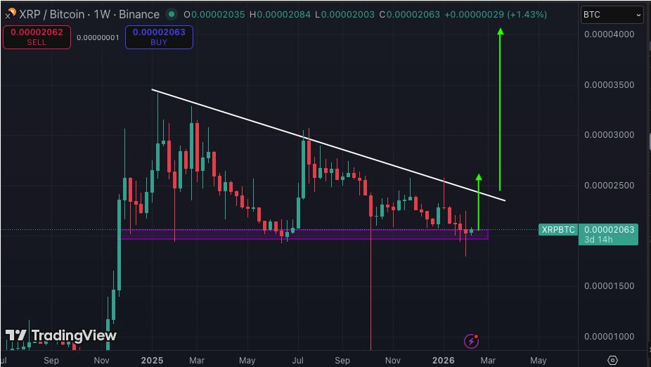 👉 XRP is sitting at a make-or-break level against Bitcoin after spending months consolidating near horizontal support on the weekly timeframe. Trading around 0.0000206 BTC, the token has repeatedly bounced off a demand zone that first formed in late 2025 and carried into early 2026. The setup suggests XRP could be gearing up for a significant move versus BTC—one that might kick off a larger rotation across the crypto market if resistance finally breaks.