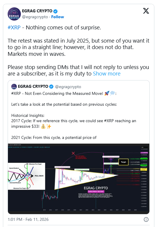 Prominent analyst Egrag Crypto argues that the current market behavior should not surprise disciplined participants. He maintains that XRP’s recent retest aligns with projections he outlined months earlier, reinforcing his long-standing view that the asset follows structured cyclical movements rather than random price action.