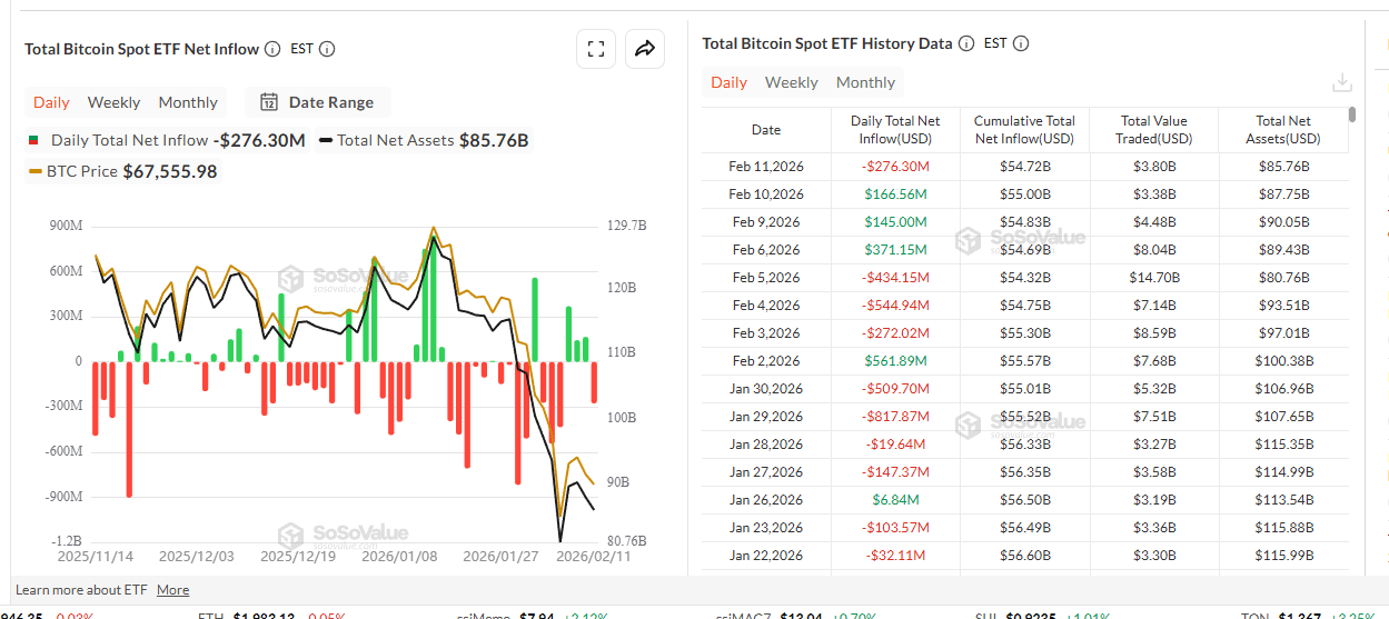 Recent data shows that ETF flows are exhibiting strong divergence. There have been sessions with net inflows of hundreds of millions of USD, but also sessions with large-scale net outflows. For example, February 11th recorded a net outflow of over $276 million, and a few days prior, there were also sessions with negative outflows of over $400-500 million.
