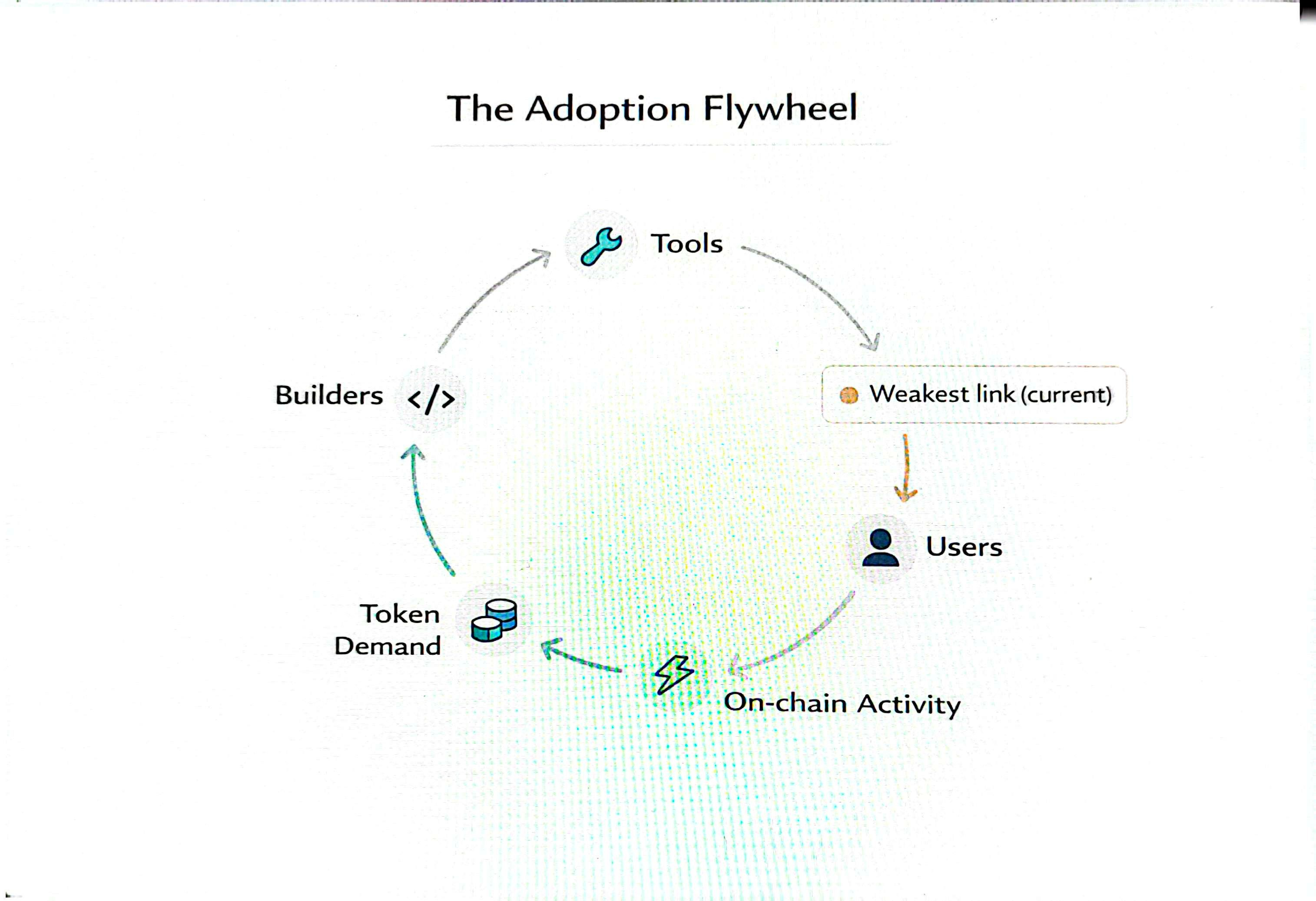 Necessary support tools Builders build apps Useful builders arrive On-chain activity increases Token utility increases More builders notice Better tools are built Repeat