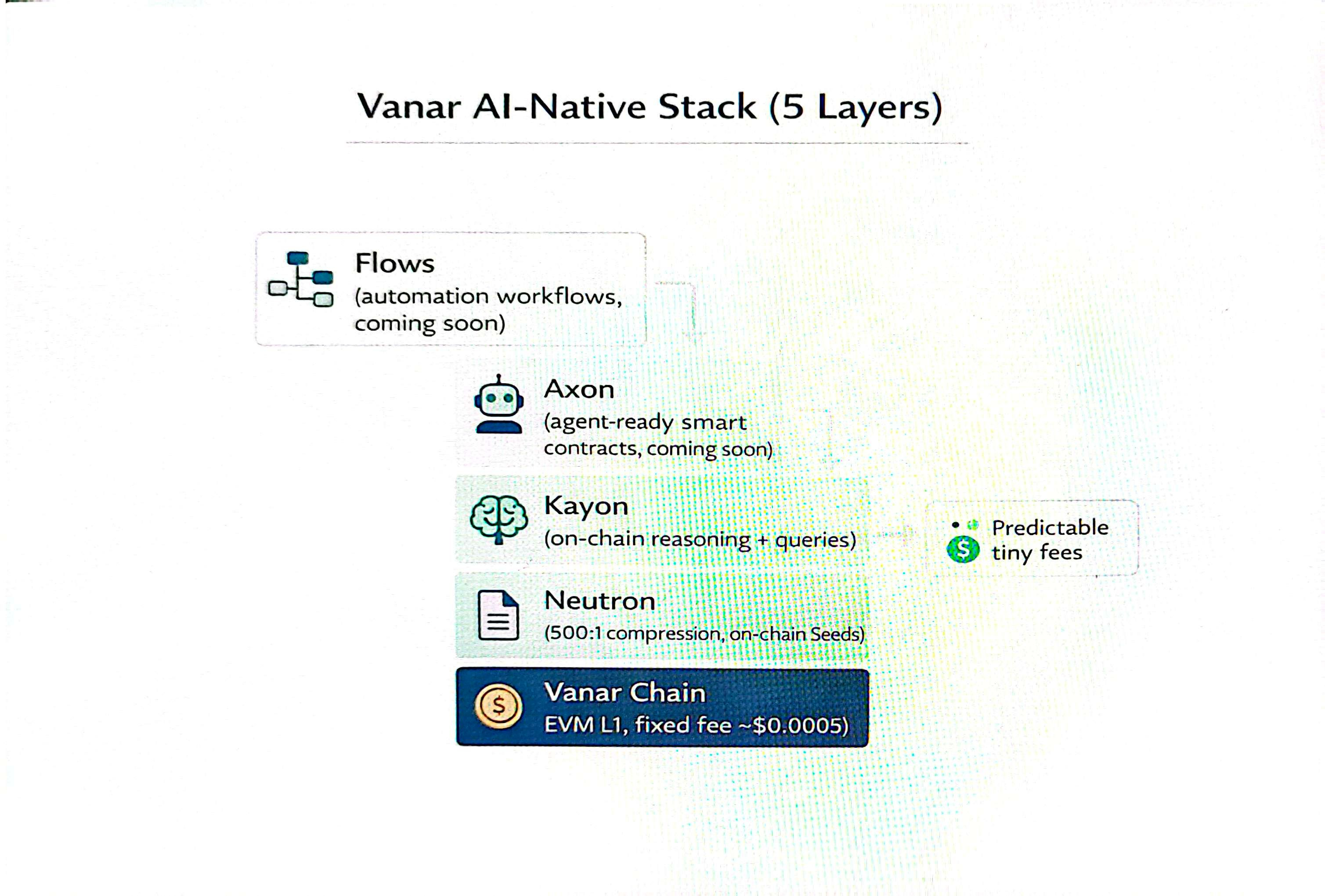 To anyone who is a latecomer, @Vanarchain is an EVM-compatible Layer 1 blockchain that markets itself as AI-native. That is, AI is not an add-on to the protocol, it is embroiled in the protocol over five layers. The base chain does transactions on a fixed charge of about 0.0005. Neutron compresses files up to 500:1 and stores them directly to the chain as a form of Seed. Kayon is an on-chain reasoning engine that enables smart contracts to actually interpret the data they are storing, and not simply to refer to the data stored elsewhere.