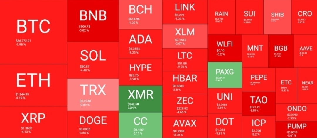 The temporary stability has shattered. After drifting sideways between $68,000 and $72,000 for several days, Bitcoin finally lost its footing earlier today, tumbling below the $67,000 mark for the first time since Friday. This downward momentum has dragged the broader market with it, forcing Ethereum under $2,000, XRP below $1.40, and leaving BNB fighting to keep its head above $600.