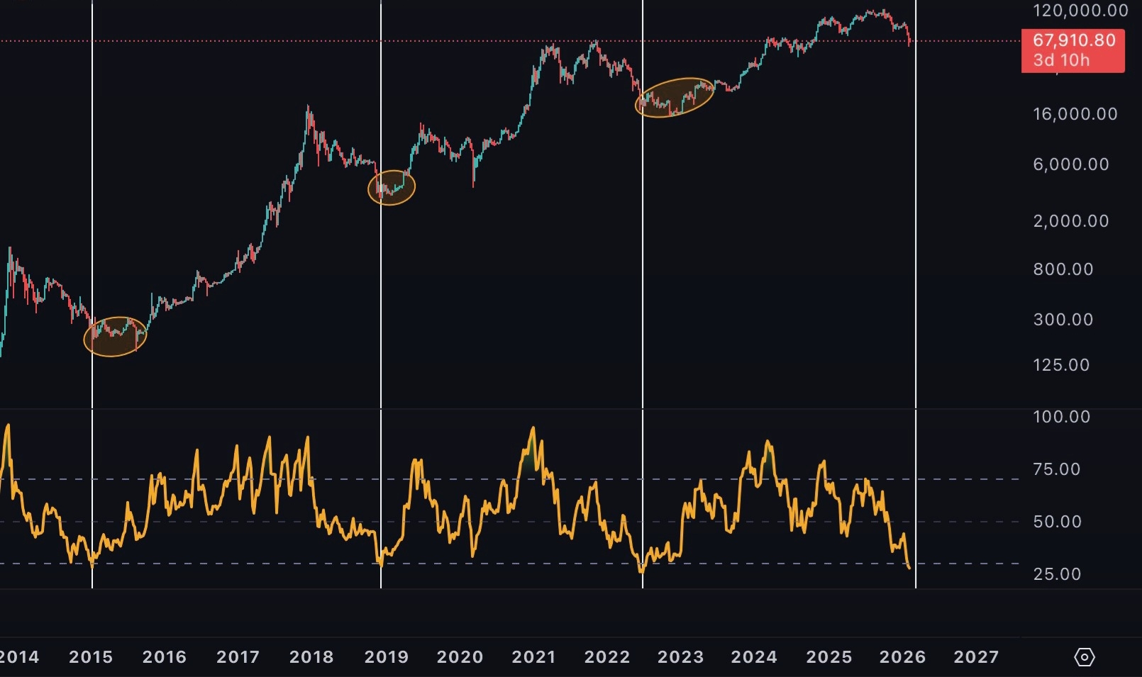 Now, in February 2026, the weekly BTC/USD chart shows the RSI entering below 30 once again (possibly the fourth or fifth time in history according to sources), with the price hovering around $67,910 after a sharp correction from previous peaks above $120,000