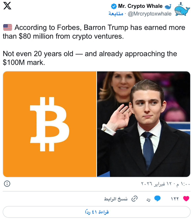 According to reports, Baron Trump has earned over 80 million dollars from cryptocurrency-related projects.