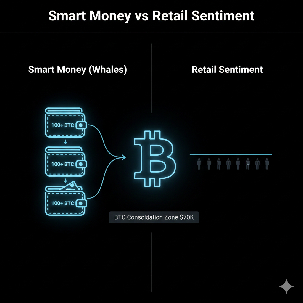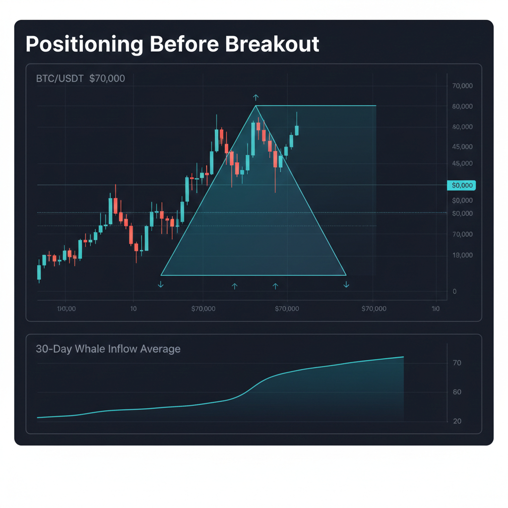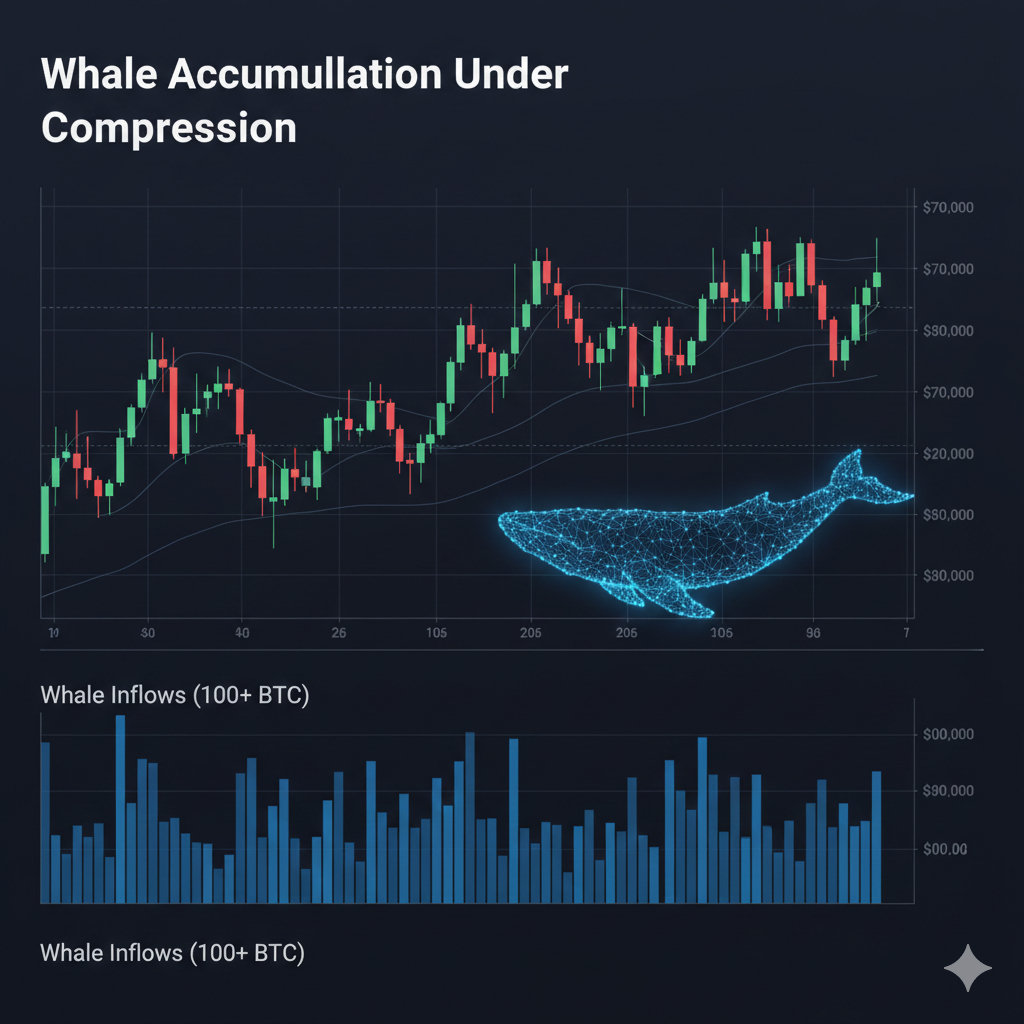 Whale wallets holding 100+ BTC have started increasing inflows again, with activity pushing back toward the 2,900 BTC zone. What makes this notable is the timing — price is compressing while large holders are accumulating.