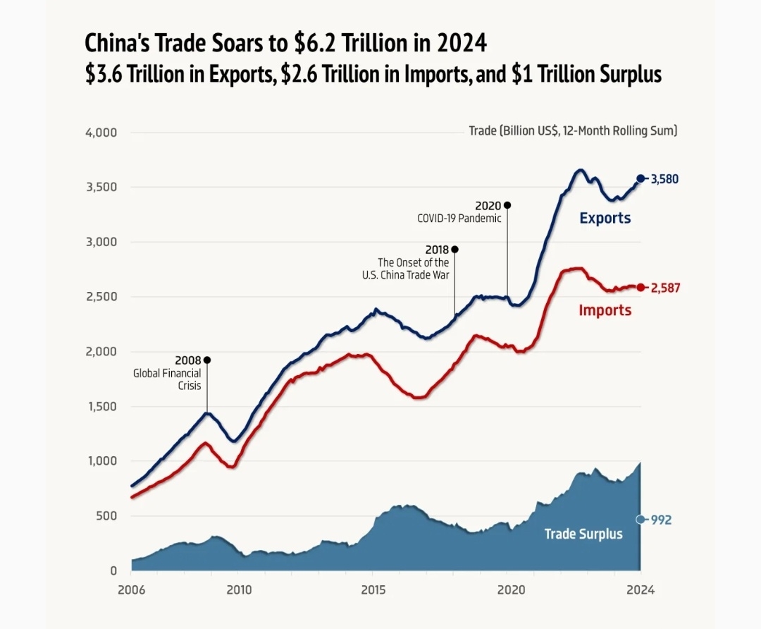 Between 2019 and 2024, China's exports surged by 43%, rising from $2.5 trillion to $3.6 trillion. Imports increased by 25%, growing from $2.1 trillion to $2.6 trillion. This rapid growth drove a 130% expansion in China's trade surplus, more than doubling from $430 billion to $990 billion.