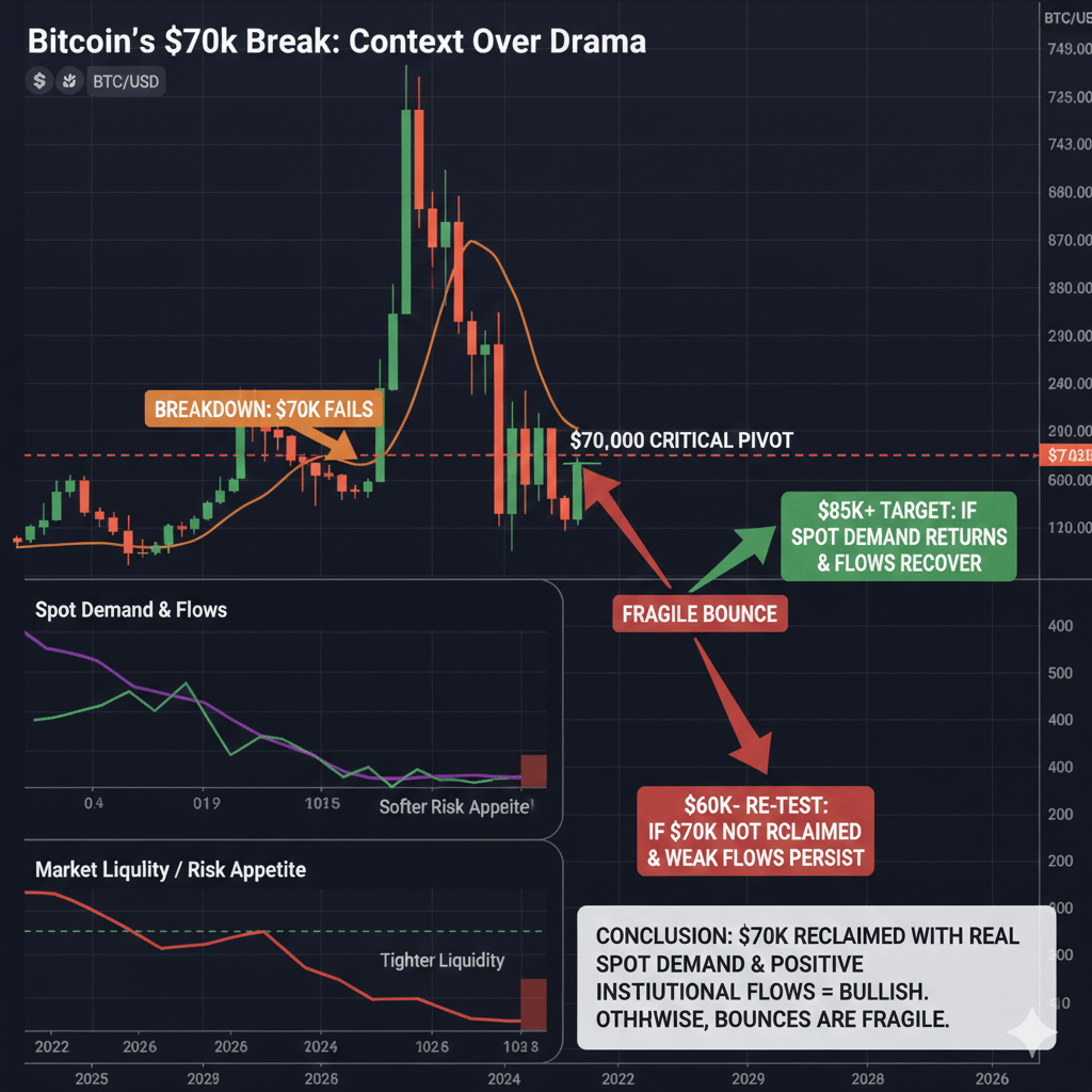 Bitcoin’s breaks below $70,000 is less about drama and more about context: softer risk appetite, tighter liquidity expectations, and a market that has struggled to sustain rebounds. A sensible Bitcoin price prediction now depends on whether $70,000 is reclaimed with real spot demand and whether institutional flows stop bleeding, because without those two shifts, bounces can remain fragile.