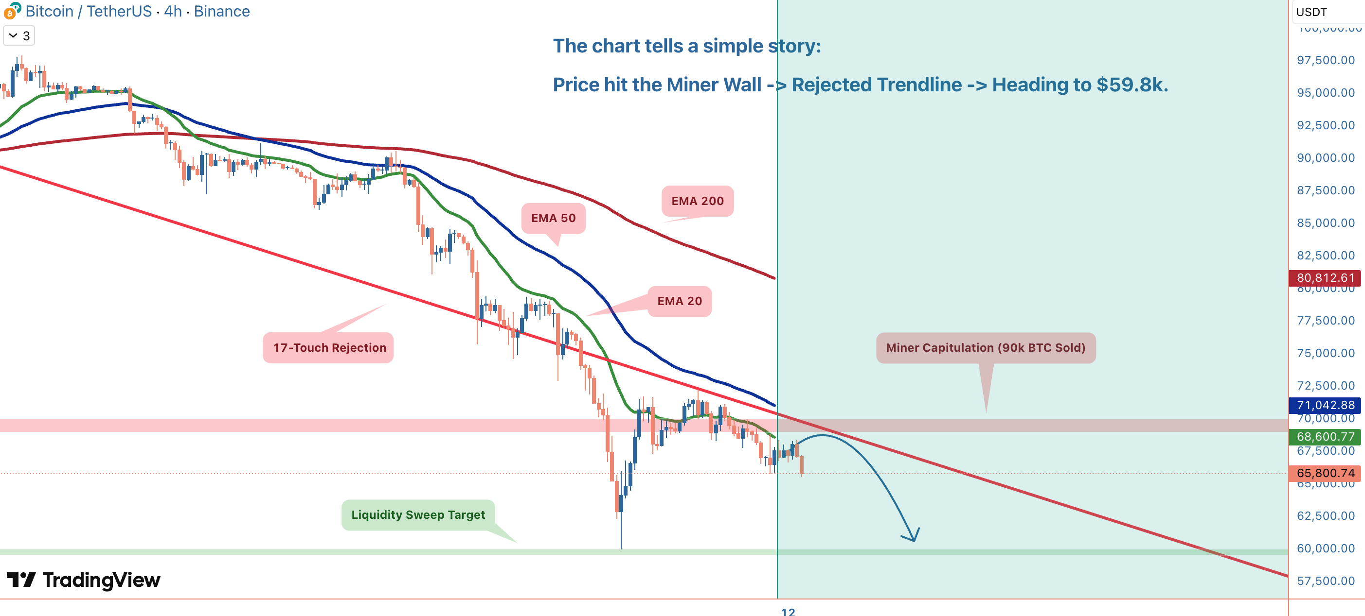• Stop: 4-hour close above $70,500 (invalidates miner capitulation theory)